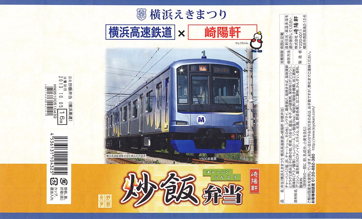 2019(令和元)年10月5日の調製である、横浜駅弁の掛紙。10月1日から14日までの「第8回横浜えきまつり」の開催に合わせて、横浜駅に乗り入れる鉄道会社6社それぞれの電車を掛紙にしたバージョンの横浜高速鉄道版で、期間中の土休日に横浜駅エリアで販売。