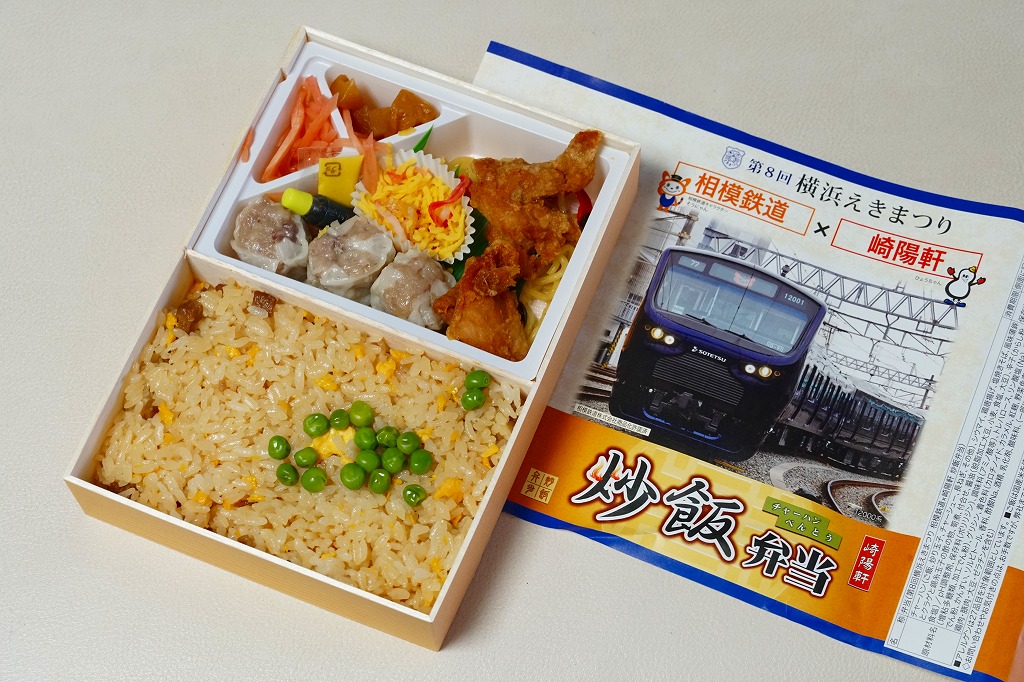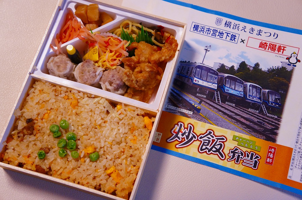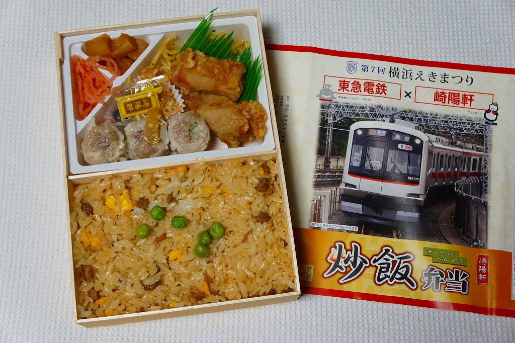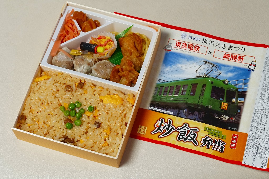 写真の電車は、Y500系電車。引き続き横浜高速鉄道の電車は、2004(平成16)年2月の開業からこのタイプのみ。開業10周年のヘッドマークが取り付けられている。掛紙以外は通常の「炒飯弁当」と同じ。
