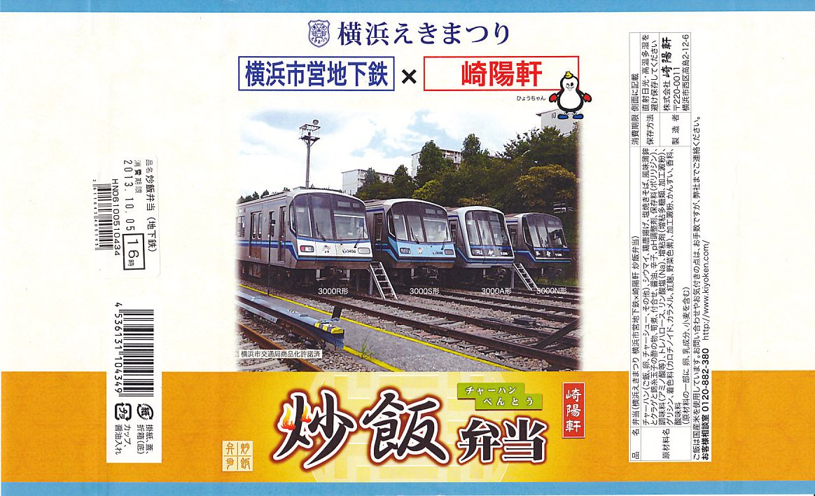 2013(平成25)年10月5日の調製である、横浜駅弁の掛紙。2013年10月4日から14日までの「第2回横浜えきまつり」の開催に合わせて、横浜駅に乗り入れる鉄道会社6社それぞれの電車を掛紙にしたバージョンの、横浜市営地下鉄(横浜市交通局)版。