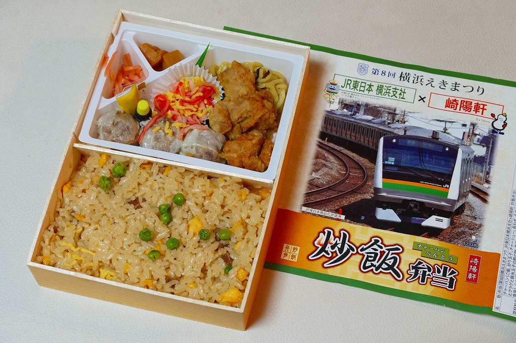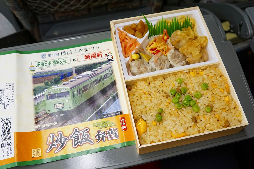写真の車両は、1972(昭和47)年10月から1989(平成元)年2月まで横浜線で運用されていた103系電車。京浜東北・根岸線へ乗り入れた際の誤乗防止として「横浜線」の大きなヘッドマークを掲げていたことが特徴。首都圏各線の中古車が集められたため、ひとつの運行系統でひとつの色を使った他の路線とは違い、写真の緑色の他に青色、黄色、赤色の電車が混成で走っていた。掛紙以外は通常の「炒飯弁当」と同じ。