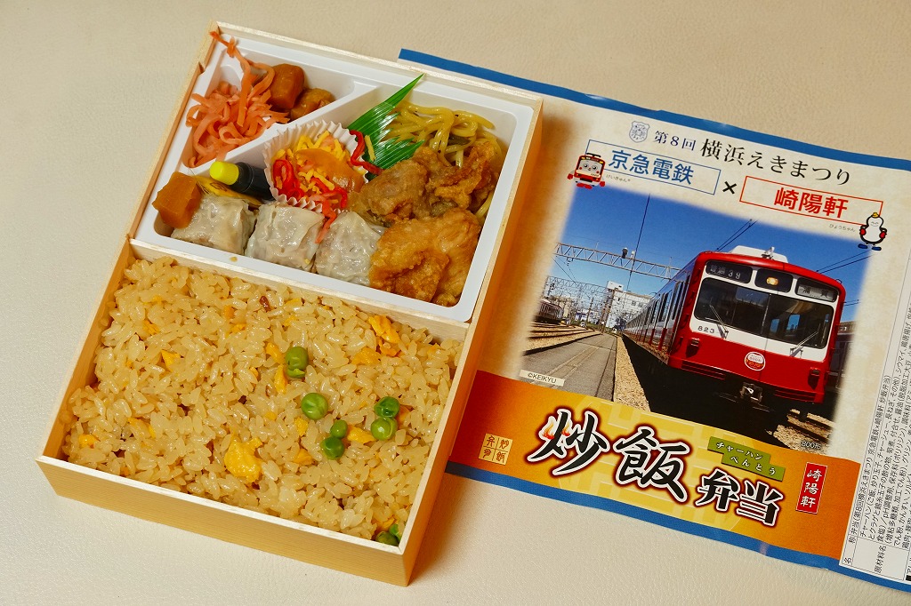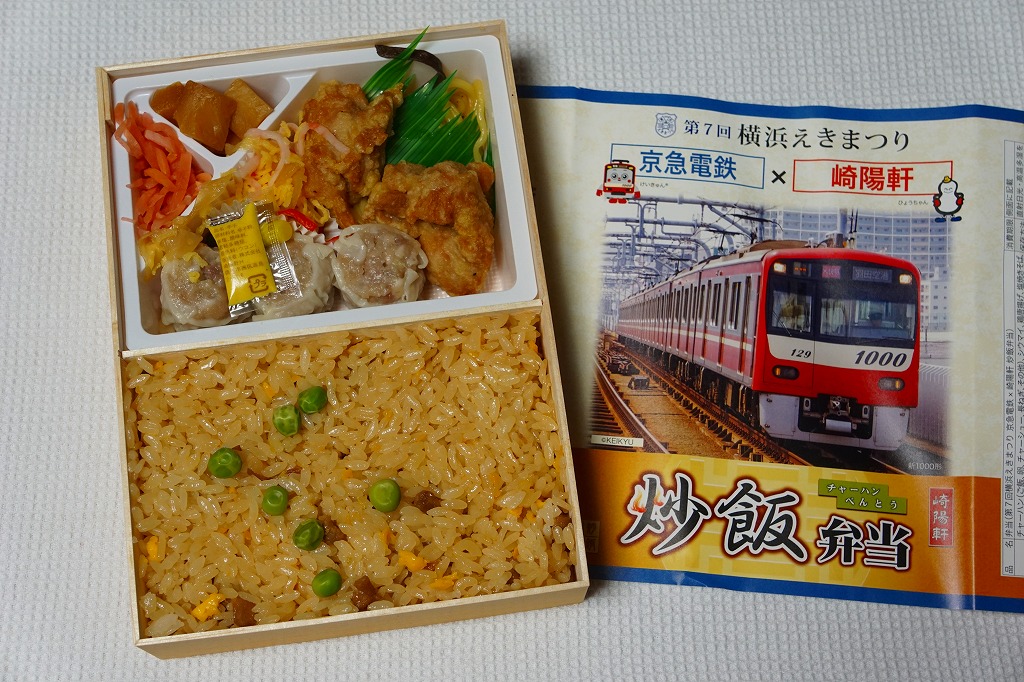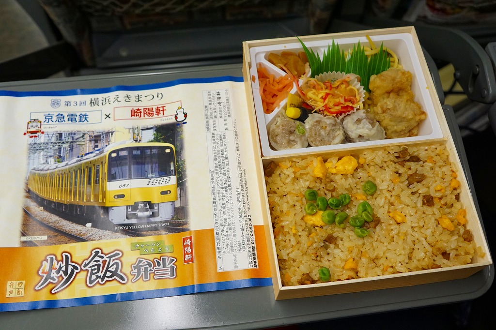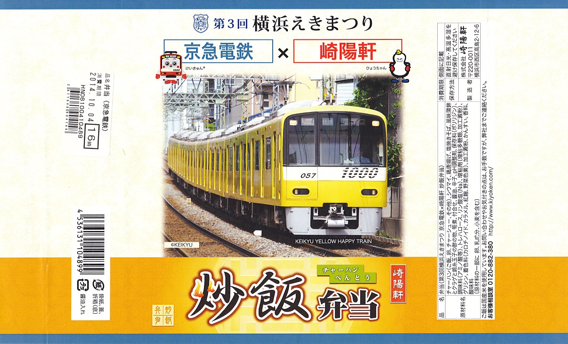 写真の車両は、2014(平成26)年5月デビューの黄色い新1000形電車「KEIKYU YELLOW HAPPY TRAIN」。黄色い電動貨車を見たら幸せになれるという、おそらく東海道・山陽新幹線の新幹線電気軌道総合試験車「ドクターイエロー」のそれに端を発すると思われる噂に基づき、普段は赤い電車のうち1本に黄色い塗装を施したもの。1本だけなのでなかなか見られないが、京急の公式サイトで時刻表が公開されているため、狙い撃ちができる。掛紙以外は通常の「炒飯弁当」と同じ。