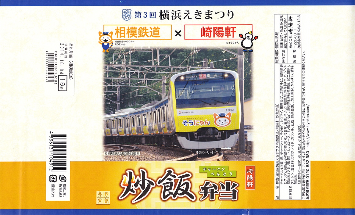 写真の電車は、2014(平成26)年5月デビューの11000系電車「そうにゃんトレイン」。前月に登場した相鉄のゆるキャラ「そうにゃん」のラッピング電車である。タヌキに見えるが、ネコのキャラクター。掛紙以外は通常の「炒飯弁当」と同じ。