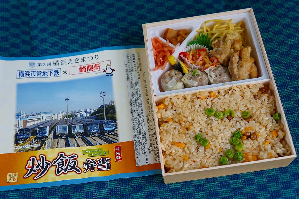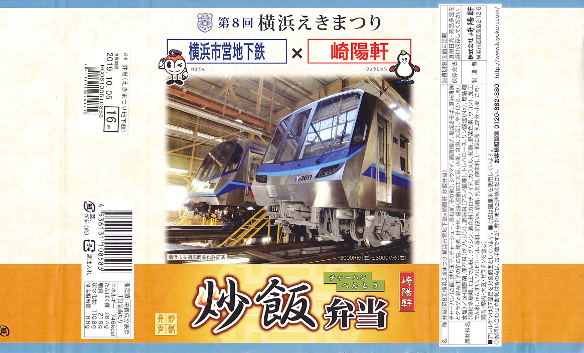 2019(令和元)年10月5日の調製である、横浜駅弁の掛紙。10月1日から14日までの「第8回横浜えきまつり」の開催に合わせて、横浜駅に乗り入れる鉄道会社6社それぞれの電車を掛紙にしたバージョンの横浜市営地下鉄版で、期間中の土休日に横浜駅エリアで販売。