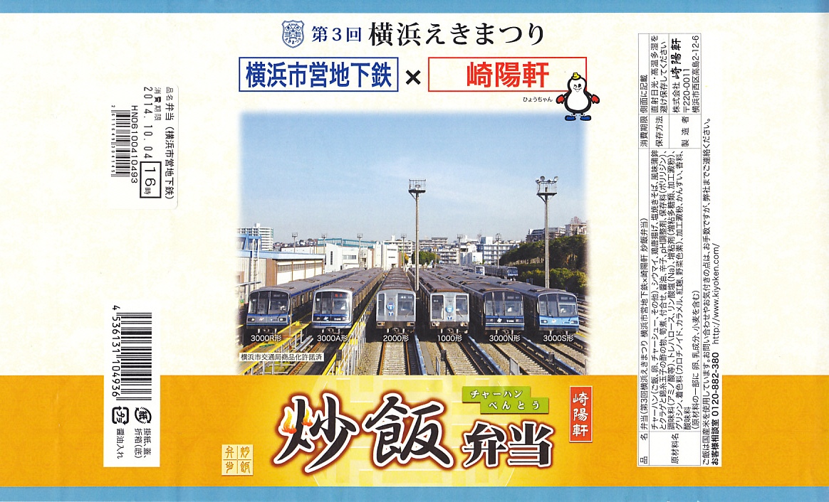 2014(平成26)年10月4日の調製である、横浜駅弁の掛紙。2014年10月4日から14日までの「第3回横浜えきまつり」の開催に合わせて、横浜駅に乗り入れる鉄道会社6社それぞれの電車を掛紙にしたバージョンの、横浜市営地下鉄版。
