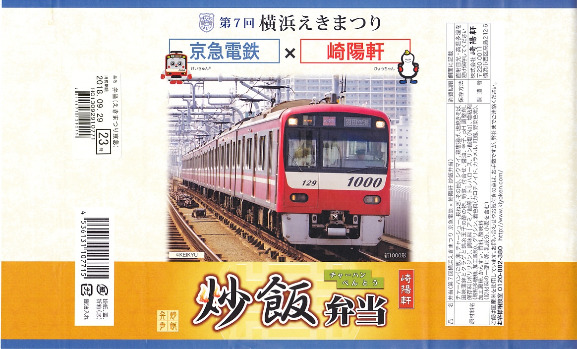 2018(平成30)年9月29日の調製である、横浜駅弁の掛紙。2018年9月29日から10月14日までの「第7回横浜えきまつり」の開催に合わせて、横浜駅に乗り入れる鉄道会社6社それぞれの電車を掛紙にしたバージョンの京急電鉄版で、期間中の土休日に横浜駅エリアで販売。