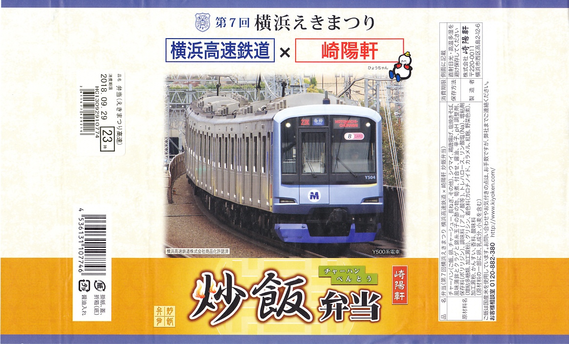2018(平成30)年9月29日の調製である、横浜駅弁の掛紙。2018年9月29日から10月14日までの「第7回横浜えきまつり」の開催に合わせて、横浜駅に乗り入れる鉄道会社6社それぞれの電車を掛紙にしたバージョンの横浜高速鉄道版で、期間中の土休日に横浜駅エリアで販売。