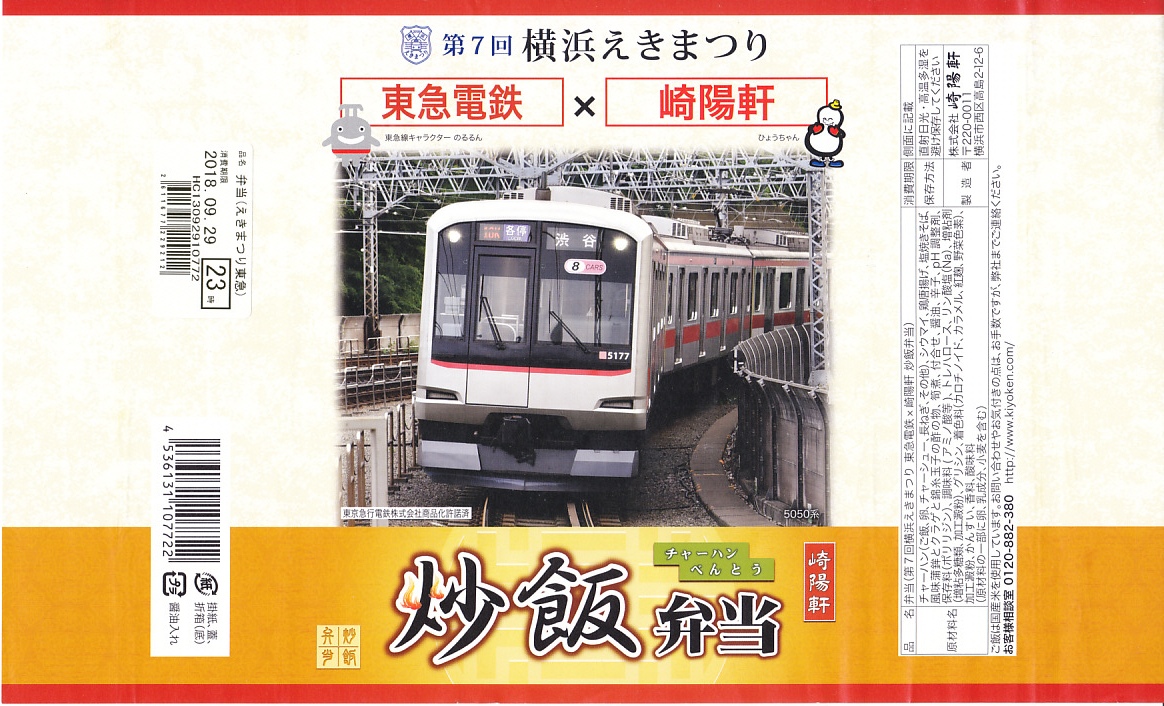2018(平成30)年9月29日の調製である、横浜駅弁の掛紙。2018年9月29日から10月14日までの「第7回横浜えきまつり」の開催に合わせて、横浜駅に乗り入れる鉄道会社6社それぞれの電車を掛紙にしたバージョンの東急電鉄版で、期間中の土休日に横浜駅エリアで販売。