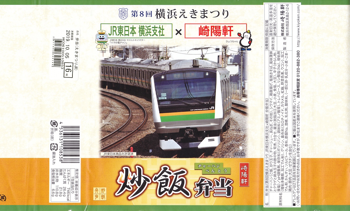 2019(令和元)年10月5日の調製である、横浜駅弁の掛紙。10月1日から14日までの「第8回横浜えきまつり」の開催に合わせて、横浜駅に乗り入れる鉄道会社6社それぞれの電車を掛紙にしたバージョンのJR東日本版で、期間中の土休日に横浜駅エリアで販売。