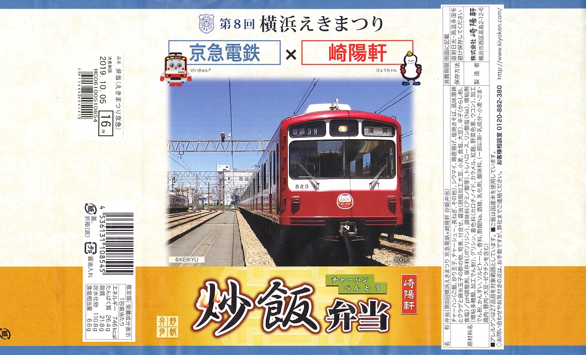 2019(令和元)年10月5日の調製である、横浜駅弁の掛紙。10月1日から14日までの「第8回横浜えきまつり」の開催に合わせて、横浜駅に乗り入れる鉄道会社6社それぞれの電車を掛紙にしたバージョンの京急電鉄版で、期間中の土休日に横浜駅エリアで販売。