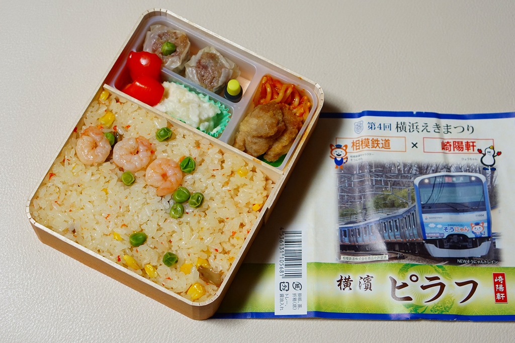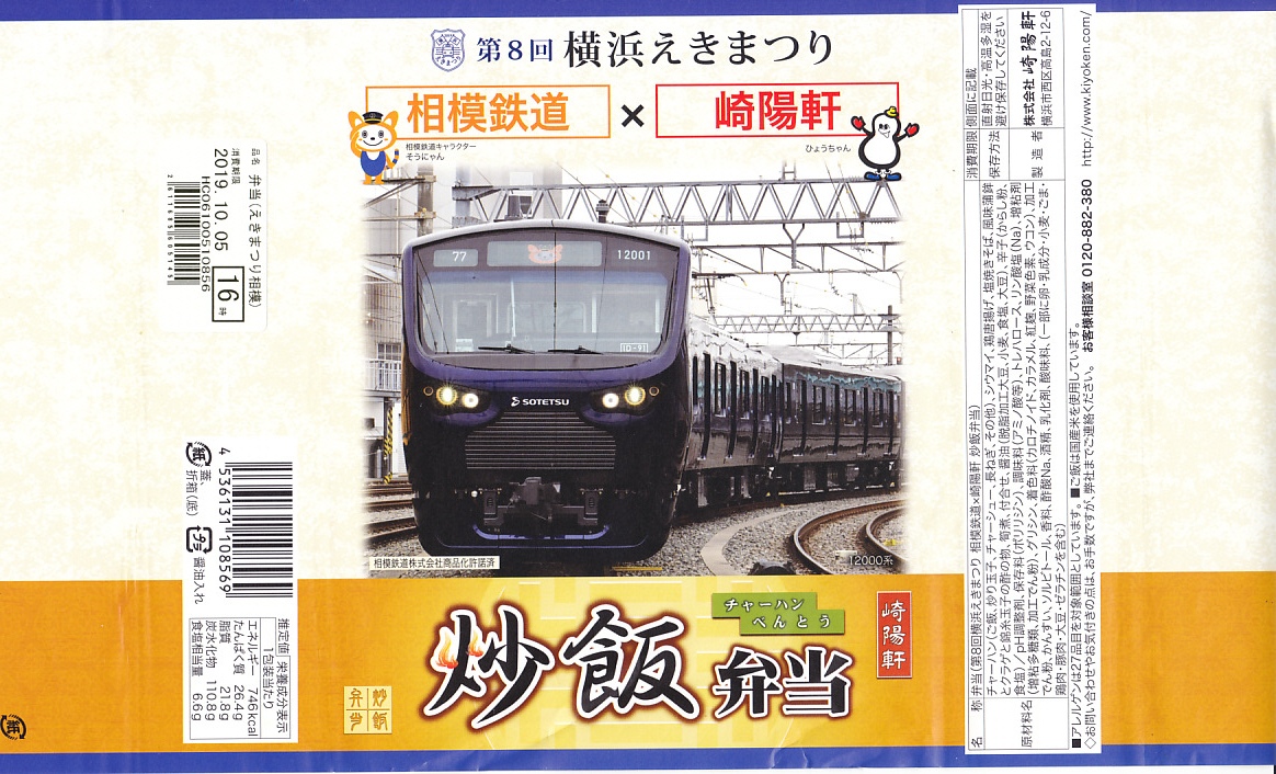 2019(令和元)年10月5日の調製である、横浜駅弁の掛紙。10月1日から14日までの「第8回横浜えきまつり」の開催に合わせて、横浜駅に乗り入れる鉄道会社6社それぞれの電車を掛紙にしたバージョンの相模鉄道版で、期間中の土休日に横浜駅エリアで販売。