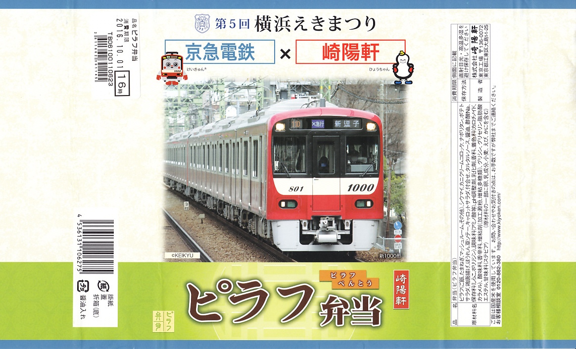 2016(平成28)年10月1日の調製である、横浜駅弁の掛紙。2016年10月1日から16日までの「第5回横浜えきまつり」の開催に合わせて、横浜駅に乗り入れる鉄道会社のうち、東急を除く5社それぞれの電車を掛紙にしたバージョンの、京急電鉄版。