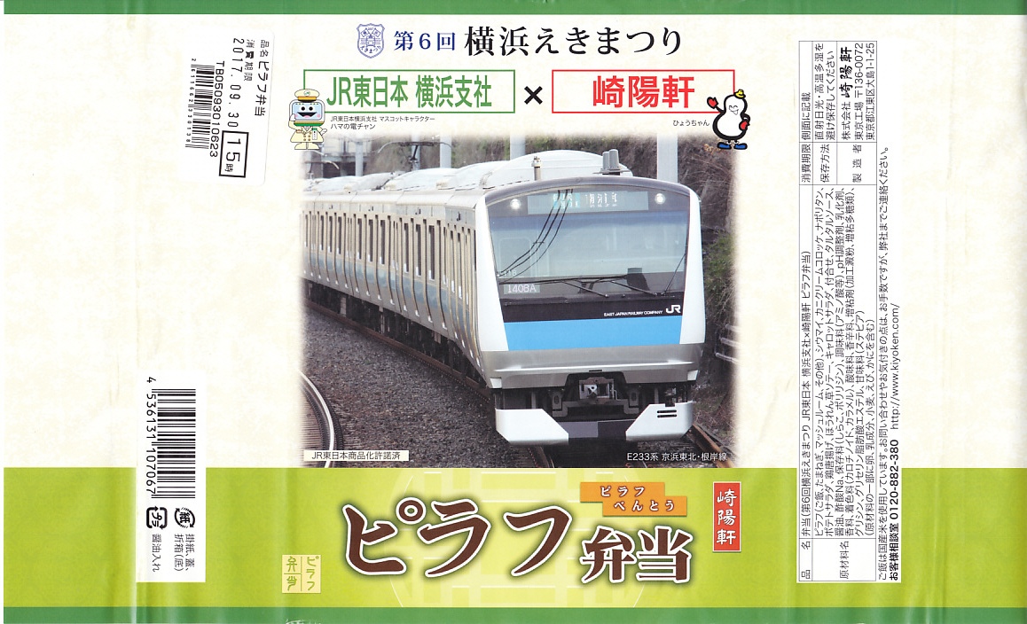 2017(平成29)年9月30日の調製である、横浜駅弁の掛紙。2017年9月30日から10月15日までの「第6回横浜えきまつり」の開催に合わせて、横浜駅に乗り入れる鉄道会社6社それぞれの電車を掛紙にしたバージョンの、JR東日本版。