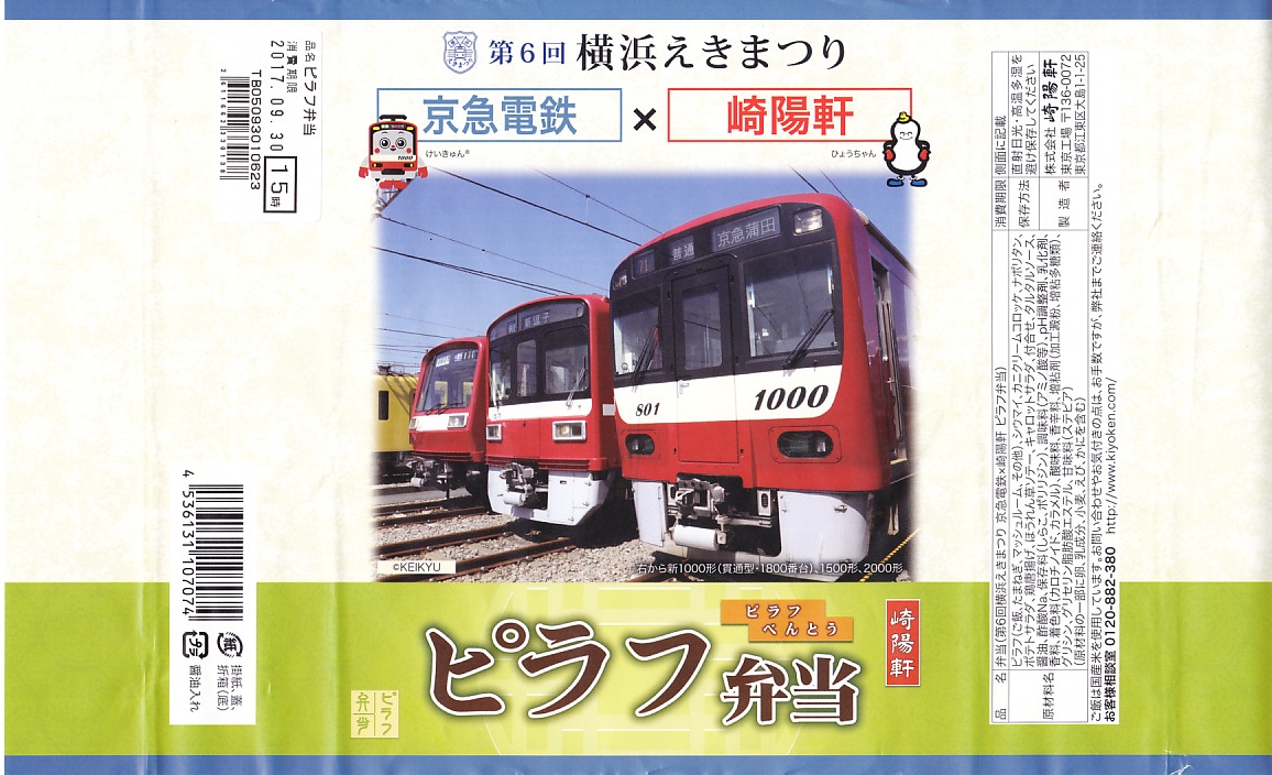 2017(平成29)年9月30日の調製である、横浜駅弁の掛紙。2017年9月30日から10月15日までの「第6回横浜えきまつり」の開催に合わせて、横浜駅に乗り入れる鉄道会社6社それぞれの電車を掛紙にしたバージョンの、京急電鉄版。