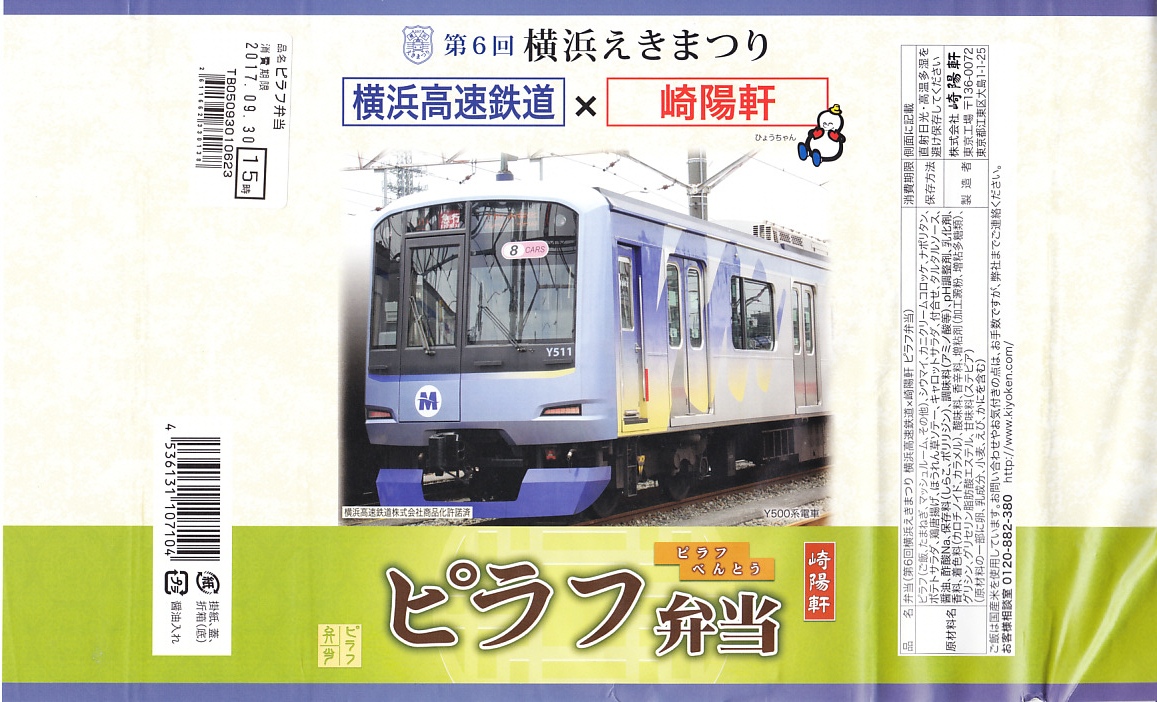 2017(平成29)年9月30日の調製である、横浜駅弁の掛紙。2017年9月30日から10月15日までの「第6回横浜えきまつり」の開催に合わせて、横浜駅に乗り入れる鉄道会社6社それぞれの電車を掛紙にしたバージョンの、横浜高速鉄道版。