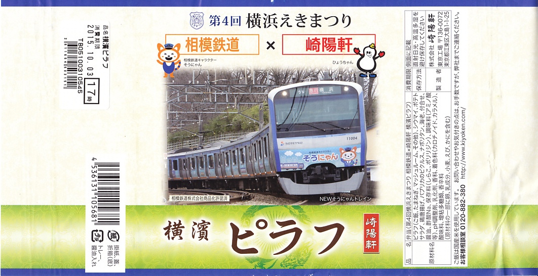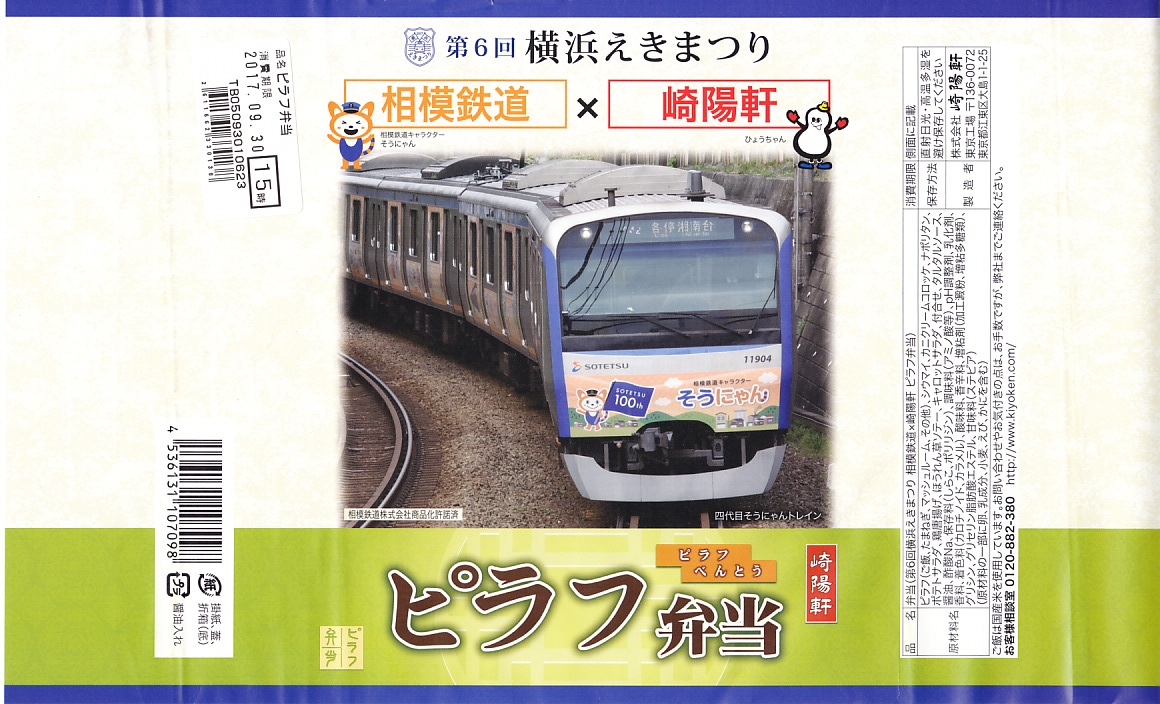 写真の車両は、2015(平成27)年3月デビューの11000系電車「NEWそうにゃんトレイン」。前年4月登場の相鉄のゆるキャラ「そうにゃん」の、その翌月にデビューしたラッピング電車「そうにゃんトレイン」の、デザインを新しくしたもの。掛紙以外は通常の「横濱ピラフ」と同じ。
