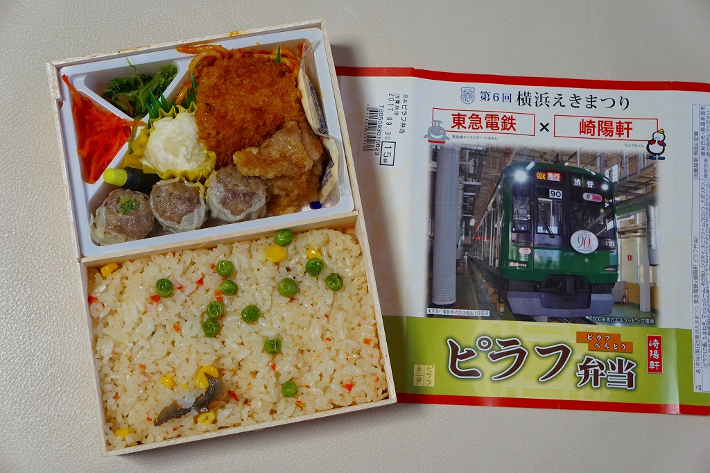 2017(平成29)年9月30日の調製である、横浜駅弁の掛紙。2017年9月30日から10月15日までの「第6回横浜えきまつり」の開催に合わせて、横浜駅に乗り入れる鉄道会社6社それぞれの電車を掛紙にしたバージョンの、3年ぶりに復活した東急電鉄版。