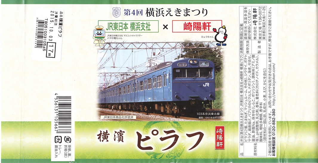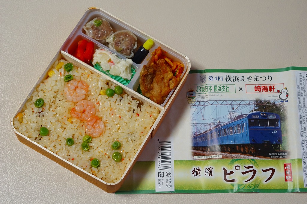 写真の車両は、1965(昭和40)年10月から1998(平成10)年3月まで京浜東北線で運行されていた103系電車。国鉄の標準的な通勤型電車として、21年間に渡り3,447両も製造され、首都圏や京阪神を中心に多くの国鉄線で使われた。掛紙以外は通常の「横濱ピラフ」と同じ。