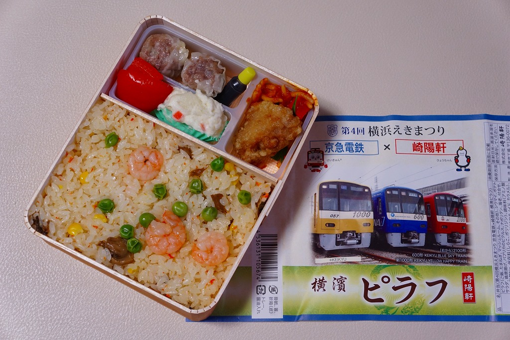 写真の車両は、2014(平成26)年5月デビューの黄色い新1000形電車「KEIKYU YELLOW HAPPY TRAIN」と、2005(平成17)年3月デビューの青い600形電車「KEIKYU BLUE SKY TRAIN」と、2013(平成25)年8月から更新工事が始まった赤い2100形電車。京急といえば赤い電車だが、羽田空港輸送のPRで青い電車が走り始め、後に「沿線に、幸せを運ぶ。」として事業用車両のような黄色い電車も走り始めた。掛紙以外は通常の「横濱ピラフ」と同じ。
