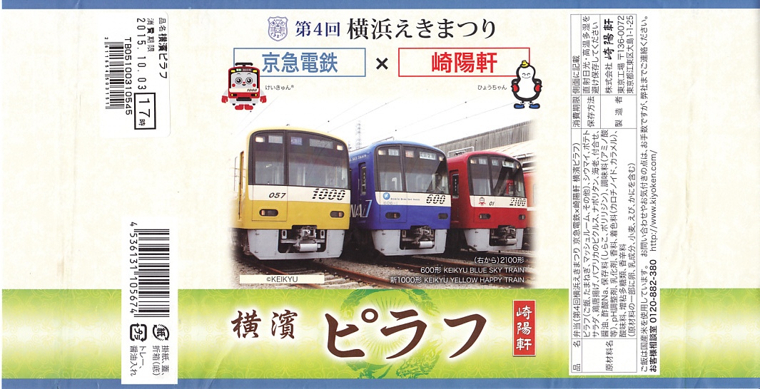 2015(平成27)年10月3日の調製である、横浜駅弁の掛紙。2015年10月3日から14日までの「第4回横浜えきまつり」の開催に合わせて、横浜駅に乗り入れる鉄道会社のうち、東急を除く5社それぞれの電車を掛紙にしたバージョンの、京急電鉄版。
