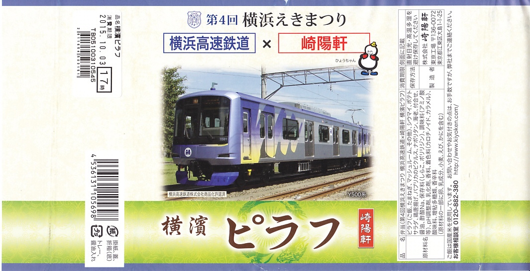 2015(平成27)年10月3日の調製である、横浜駅弁の掛紙。2015年10月3日から14日までの「第4回横浜えきまつり」の開催に合わせて、横浜駅に乗り入れる鉄道会社のうち、東急を除く5社それぞれの電車を掛紙にしたバージョンの、横浜高速鉄道版。