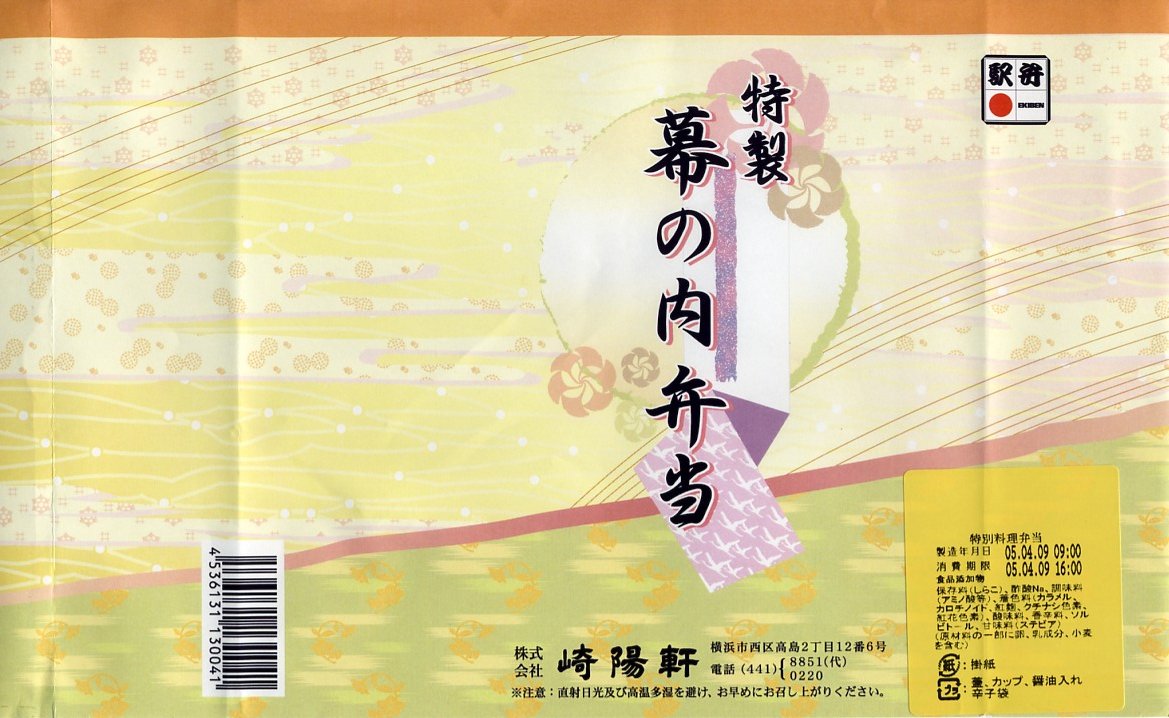 2005(平成17)年4月9日と10日に東京駅で実施の駅弁の日記念駅弁大会で販売された、崎陽軒の駅弁の日記念弁当。大きめな正方形の容器を、昨今の崎陽軒の駅弁掛紙デザインによくある淡い雰囲気の掛紙をかけて、金色のゴムでしばる。中身は桜花を載せた扇形の茶飯に、海老や焼き魚に蒲鉾と玉子焼と煮物類などを付けて、シウマイ3個を添える。