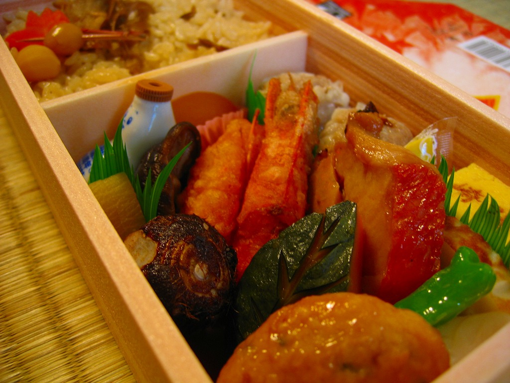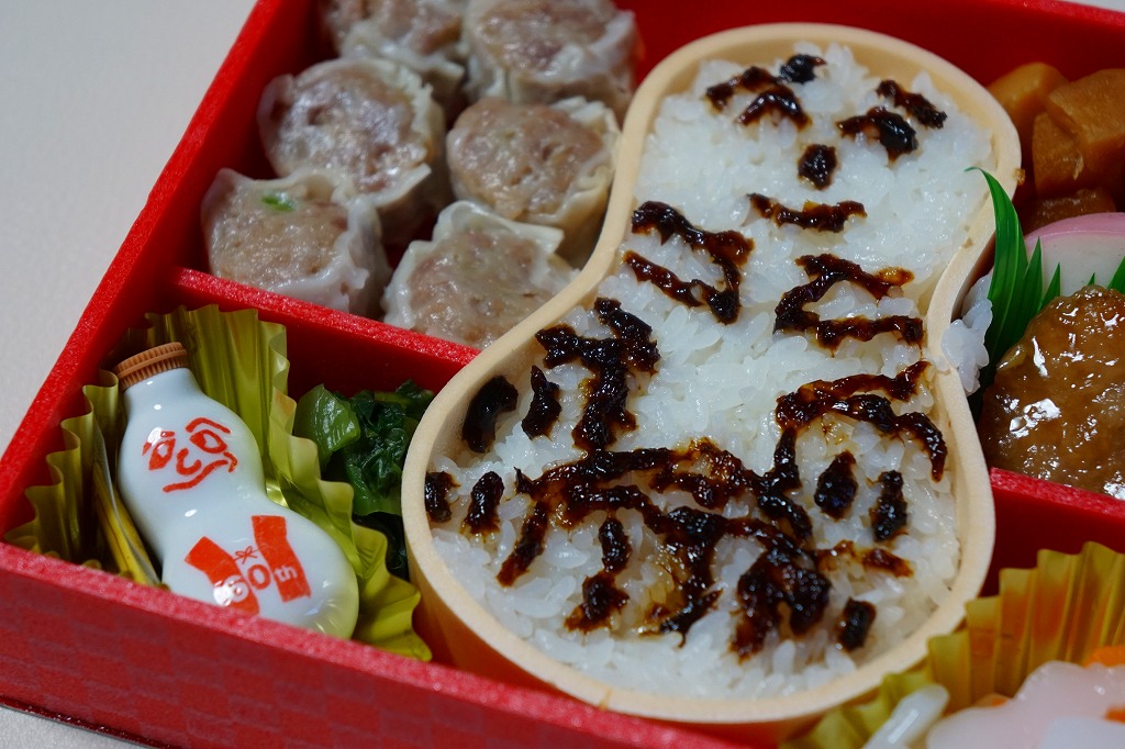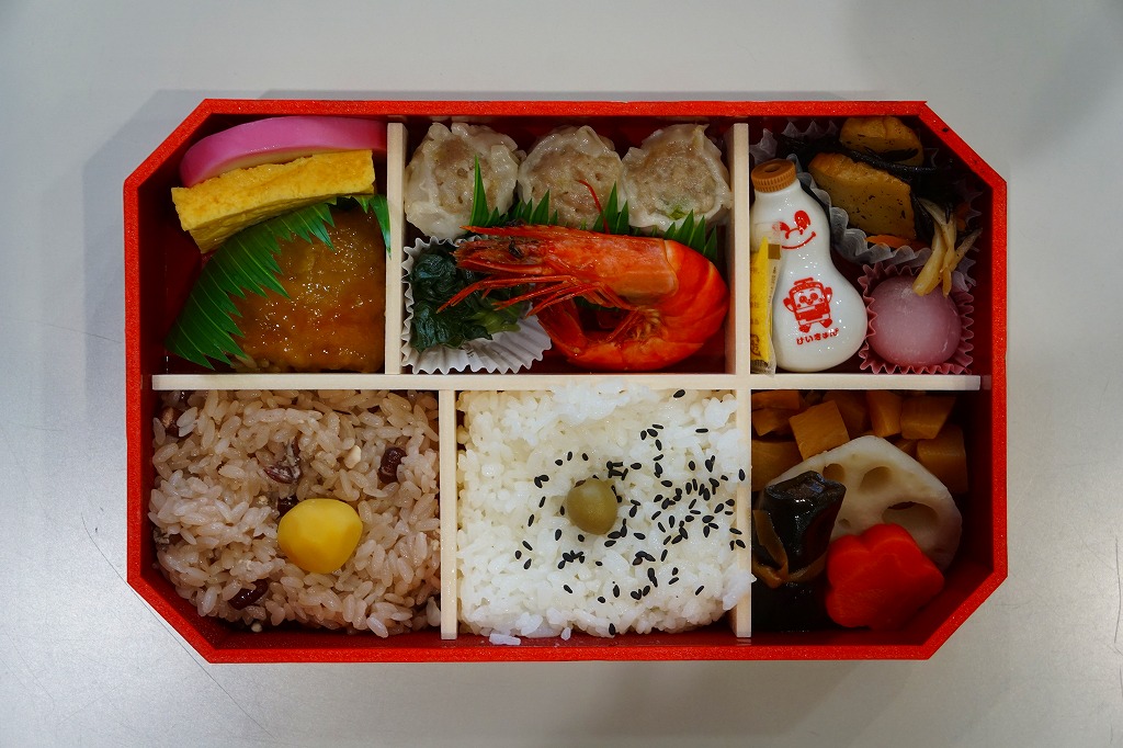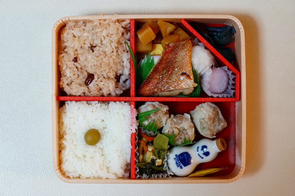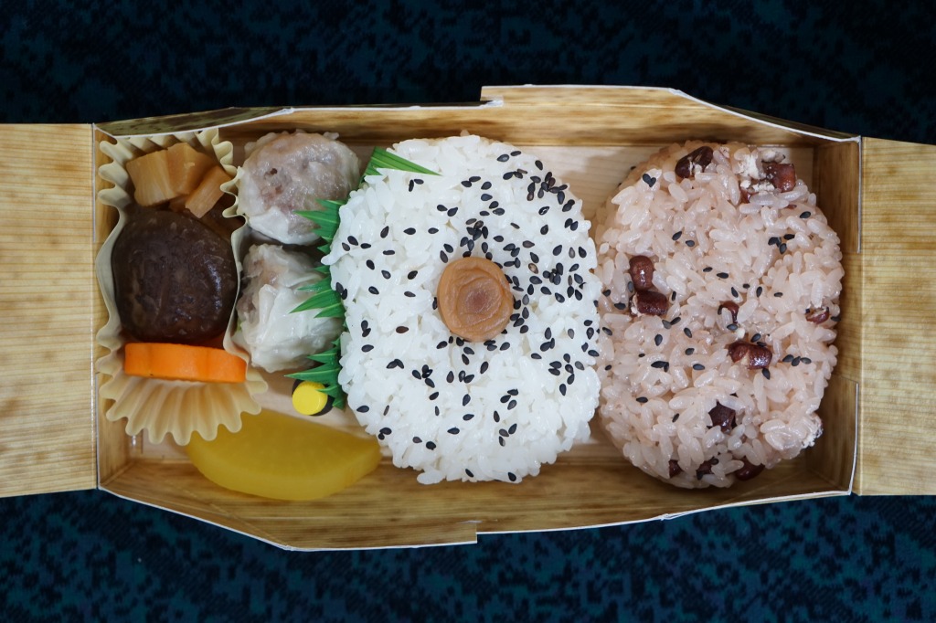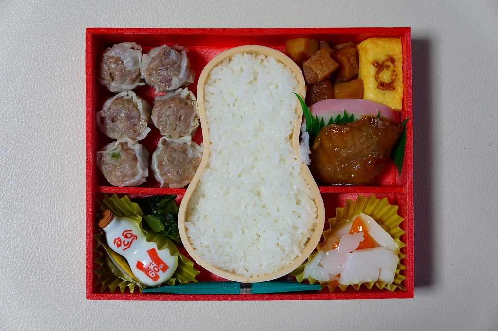 中身は赤飯、日の丸御飯、中身は赤飯、日の丸御飯、タケノコ煮その他の煮物、マグロ照焼と玉子焼とかまぼこ、有頭海老とシウマイ3個と菜の花醤油漬、ひじきなどの炒め煮と小粒大福と特製ひょうちゃん1個で6区画という、既存の駅弁の寄せ集め。