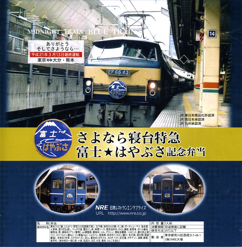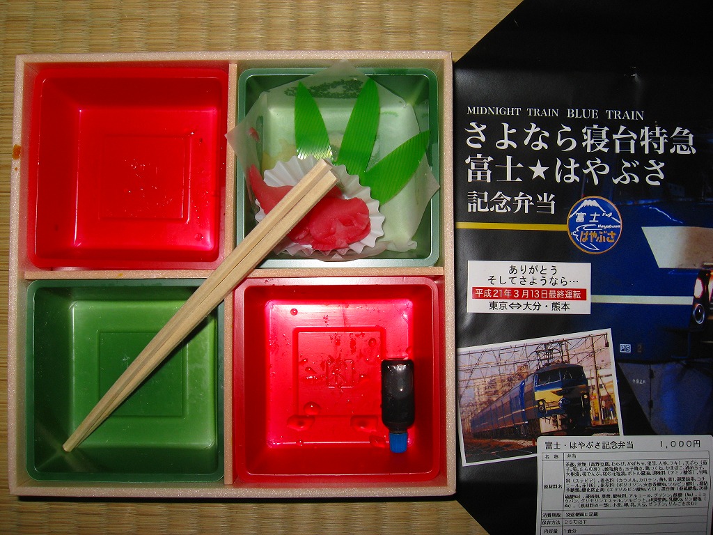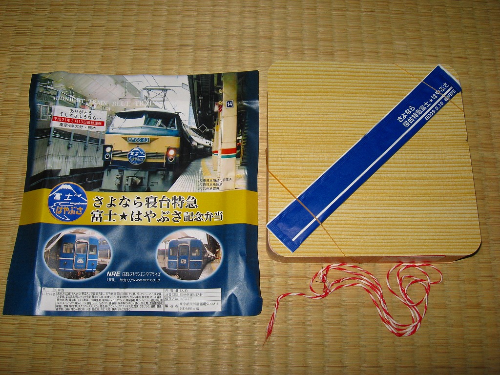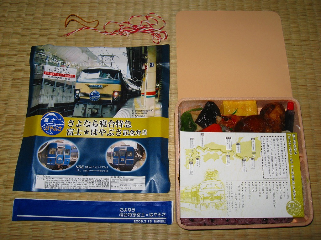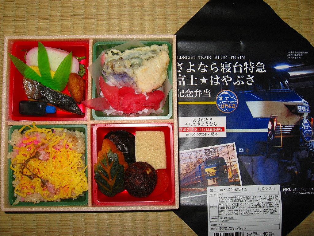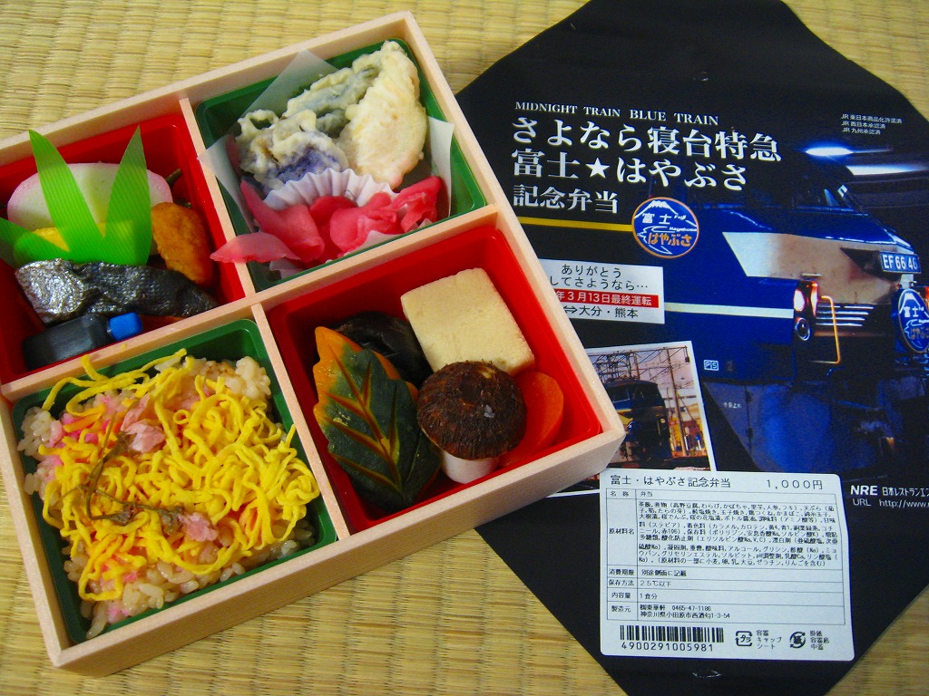 2009(平成21)年3月7・8日に横浜駅西口で開催された、寝台特急富士・はやぶさ廃止記念グッズ販売イベントにて販売されたお弁当で、調製元は小田原駅弁の東華軒。木目柄の容器を、寝台特急列車の写真を使った掛紙で包み、紙ひもで十字にしばる。松花堂タイプにトレーと仕切りで4分割された中身は、桜花や錦糸卵に桜でんぶを載せた茶飯、カボチャやサトイモなどの煮物、玉子焼に焼鮭にカマボコ、ナスとタケノコとタラの芽の天ぷらなど。