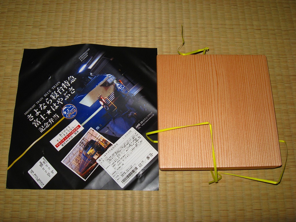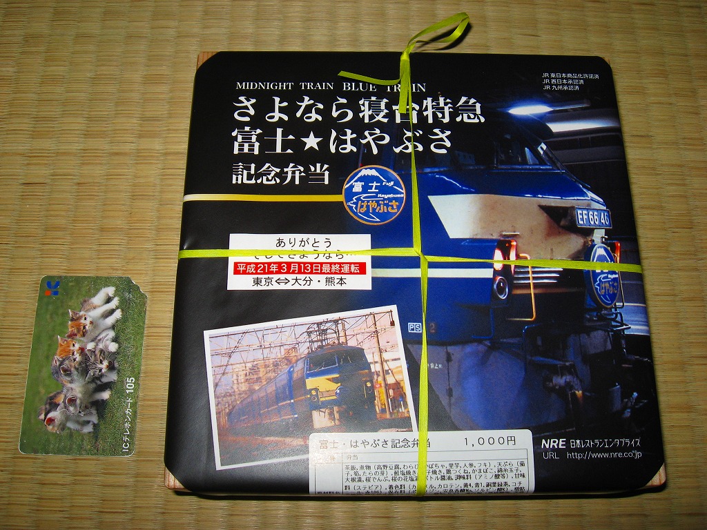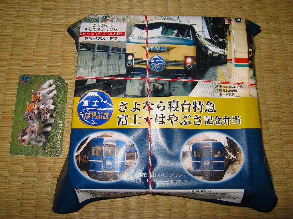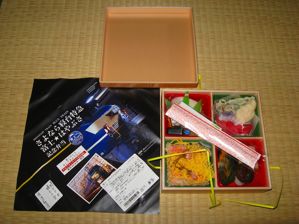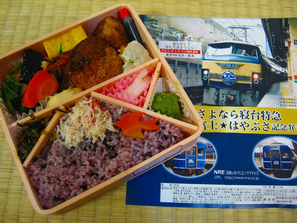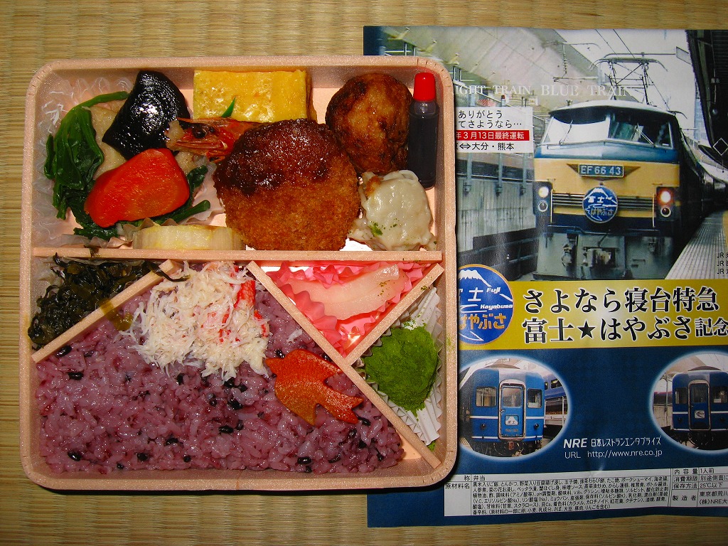 2009(平成21)年3月7・8日に横浜駅西口で開催された、寝台特急富士・はやぶさ廃止記念グッズ販売イベントにて販売されたお弁当で、調製元は小田原駅弁の東華軒。木目柄の容器を、寝台特急列車の写真を使った掛紙で包み、紙ひもで十字にしばる。松花堂タイプにトレーと仕切りで4分割された中身は、桜花や錦糸卵に桜でんぶを載せた茶飯、カボチャやサトイモなどの煮物、玉子焼に焼鮭にカマボコ、ナスとタケノコとタラの芽の天ぷらなど。