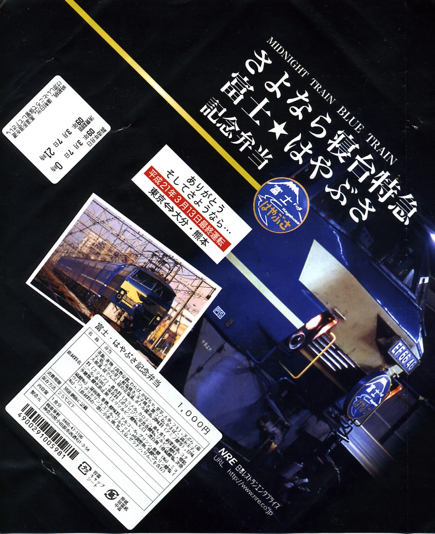 2009(平成21)年3月7・8日に横浜駅西口で開催された、寝台特急富士・はやぶさ廃止記念グッズ販売イベントにて販売されたお弁当。東京駅と鉄道博物館で3月1日から14日まで販売された「さよなら寝台特急富士★はやぶさ記念弁当」と、中身や価格は同一であるが、掛紙の絵柄や写真が異なる特別版となっている。写真の撮影地は横浜駅ではなく東京駅なのだが。