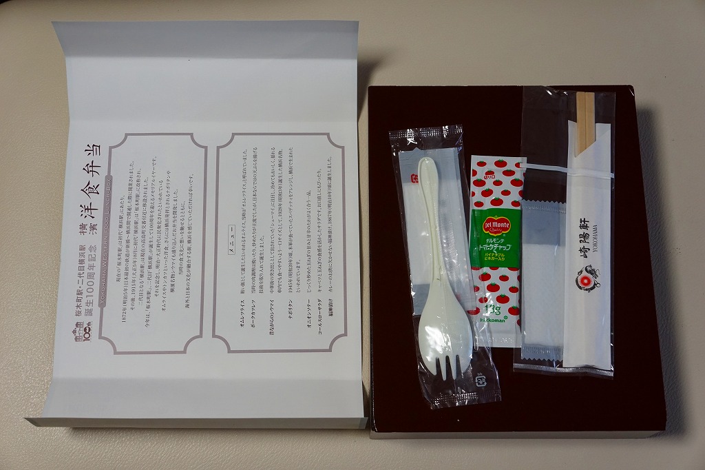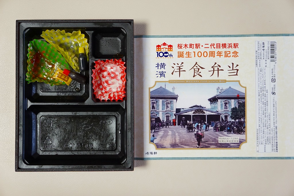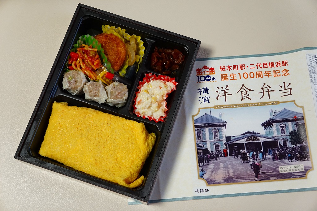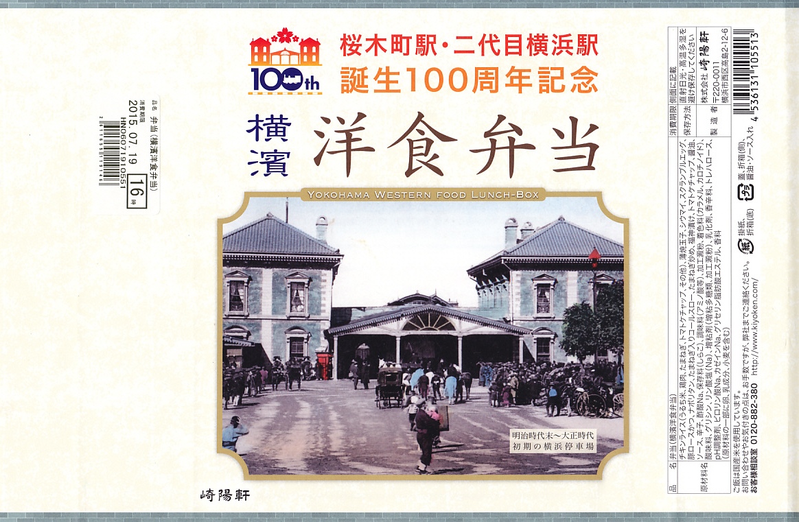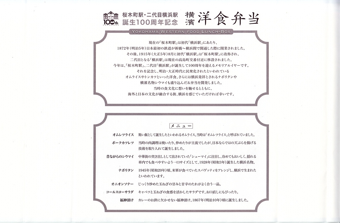 桜木町駅と二代目横浜駅の誕生100周年を記念するJR東日本横浜支社のイベントに伴い、2015(平成27)年7月18日から8月16日まで、桜木町駅や横浜駅やその周辺の崎陽軒売店で販売された記念駅弁。掛紙にはJRのイベントのロゴマークと、二代目の開業により桜木町へ改称された初代の横浜駅の写真が使われる。中身はオムレツライス、ポークカツレツ、昔ながらのシウマイ、ナポリタン、オニオンソテー、コールスローサラダ、福神漬けで、100年前の当時の食文化に想いを馳せたり、海外と日本の文化が融合する街である横浜を感じさせたのだという。