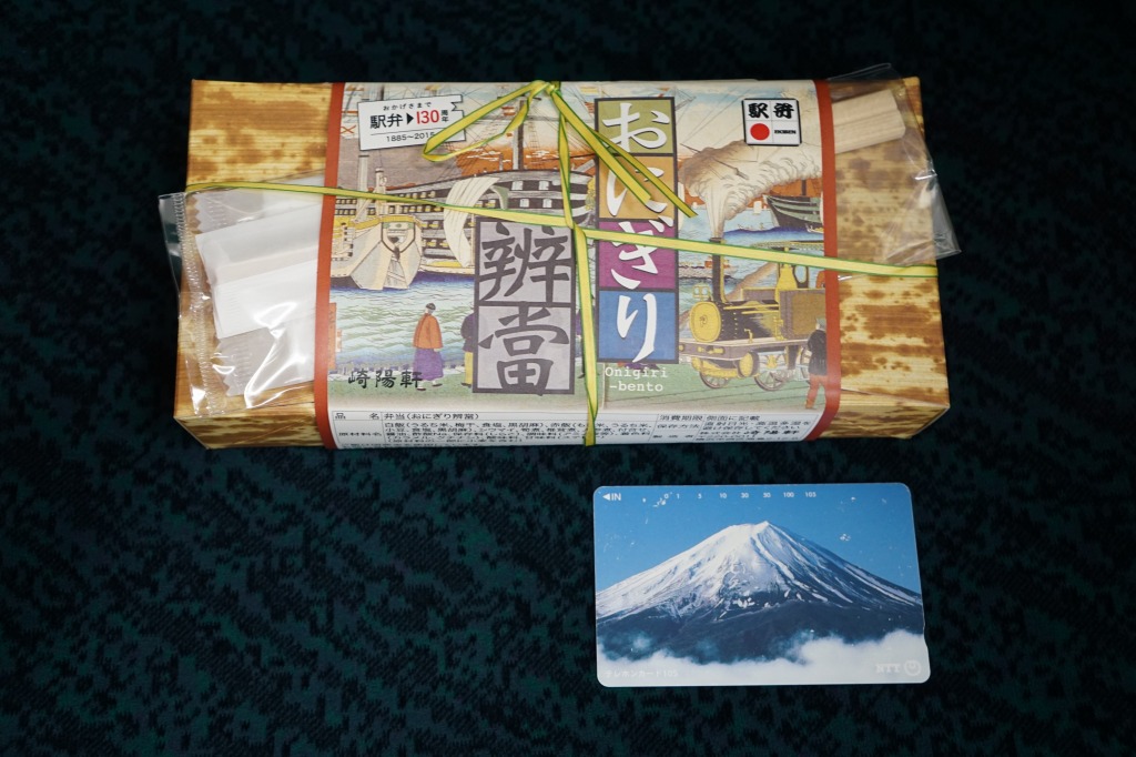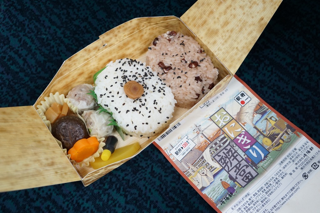 竹皮を模したボール紙の箱を、1872(明治5)年の鉄道開業当時の錦絵を思わせる絵柄の掛紙で巻く。中身は日の丸と赤飯の、おにぎりというか小判型の型押し飯と、タケノコ煮、シイタケとニンジンの煮物、たくあん、シウマイ2個。この容器と中身も駅弁発祥宇都宮駅説により、竹皮におにぎりとたくあんを包んだものを模したという。シウマイ弁当や赤飯弁当など、既存の横浜駅弁と同じ味がした。