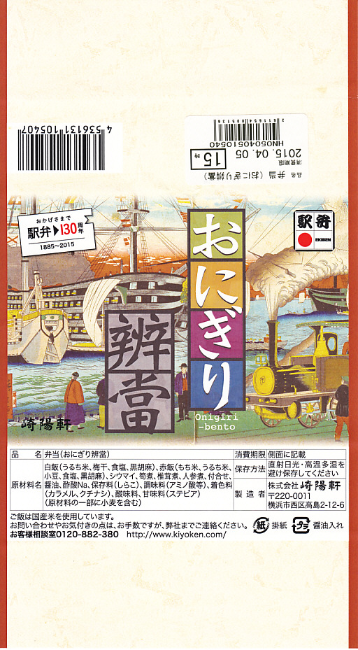 駅弁誕生130周年を記念して、2015(平成27)年4月1日から14日まで、一日50個が横浜駅構内その他崎陽軒の7店舗で販売された記念駅弁。日本鉄道構内営業中央会がこの年の4月10日の「駅弁の日」を、駅弁発祥宇都宮駅説により1885(明治18)年から数えて130周年として祝っており、その施策の一環だとも思われる。