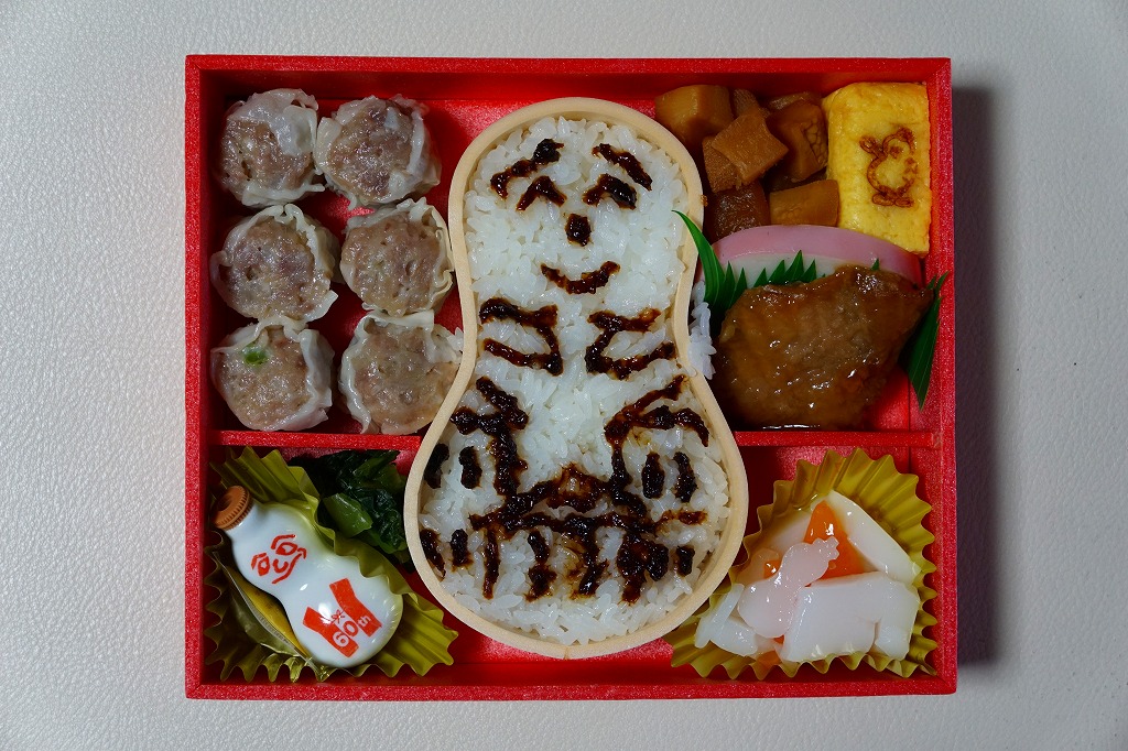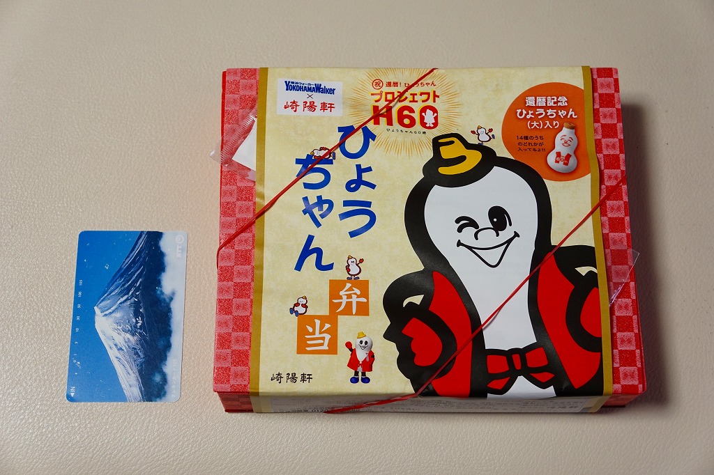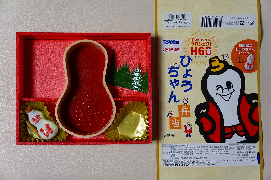 白御飯にマグロ生姜煮、かまぼこ、玉子焼、タケノコ煮、高菜漬、杏仁豆腐、シウマイ6個。名前も掛紙もひょうちゃんで、白飯がひょうちゃん型で、杏仁豆腐に混じる寒天もひょうちゃん型で、玉子焼の焼き印もひょうちゃんで、実物のひょうちゃんは100%還暦記念版が入る。一般の注目はあまりなかったと思うが、ひょうちゃんマニアにはとても贅沢に感じられる弁当であり、売店での入手は難しかった。入荷待ち行列ができたとも聞く。