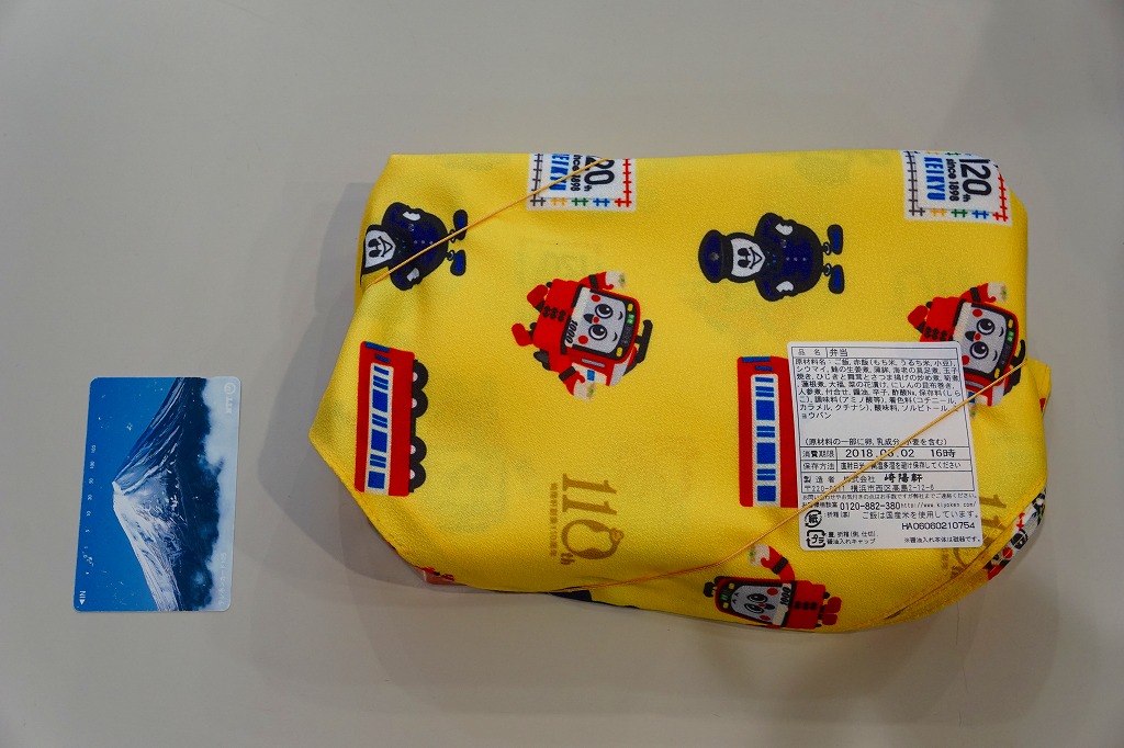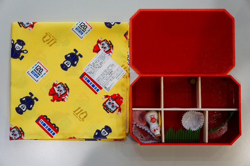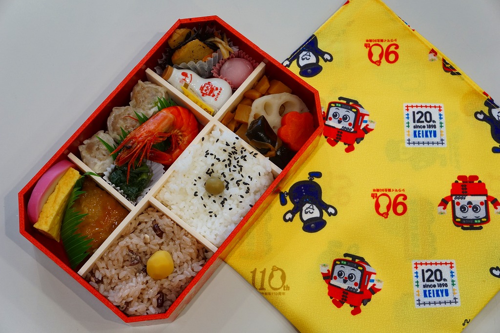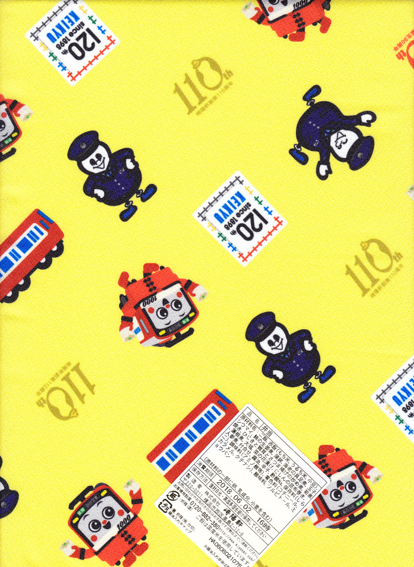 京浜急行電鉄の創立120周年と、駅弁の調製元である崎陽軒の創業110周年とシウマイ誕生90周年を記念し、2018(平成30)年6月1日から5日まで、横浜や上大岡など京浜急行電鉄沿線の崎陽軒売店で販売した記念弁当。それらの記念する絵柄「けいきゅん」、京急電車、京急120年ロゴ、ポリスひょうちゃん、崎陽軒110周年ロゴ、シウマイ90周年ロゴを並べた黄色い風呂敷で、赤飯弁当タイプの容器を包む。