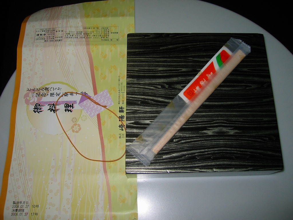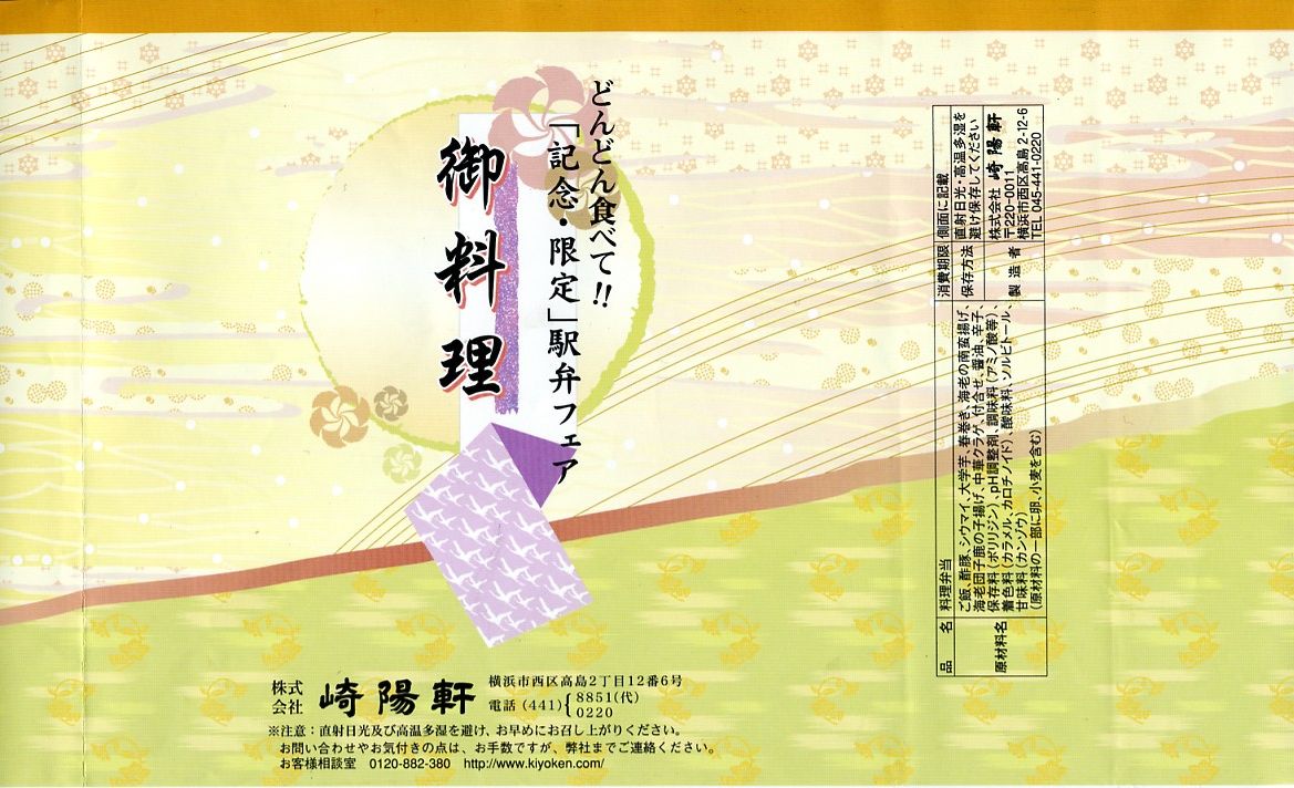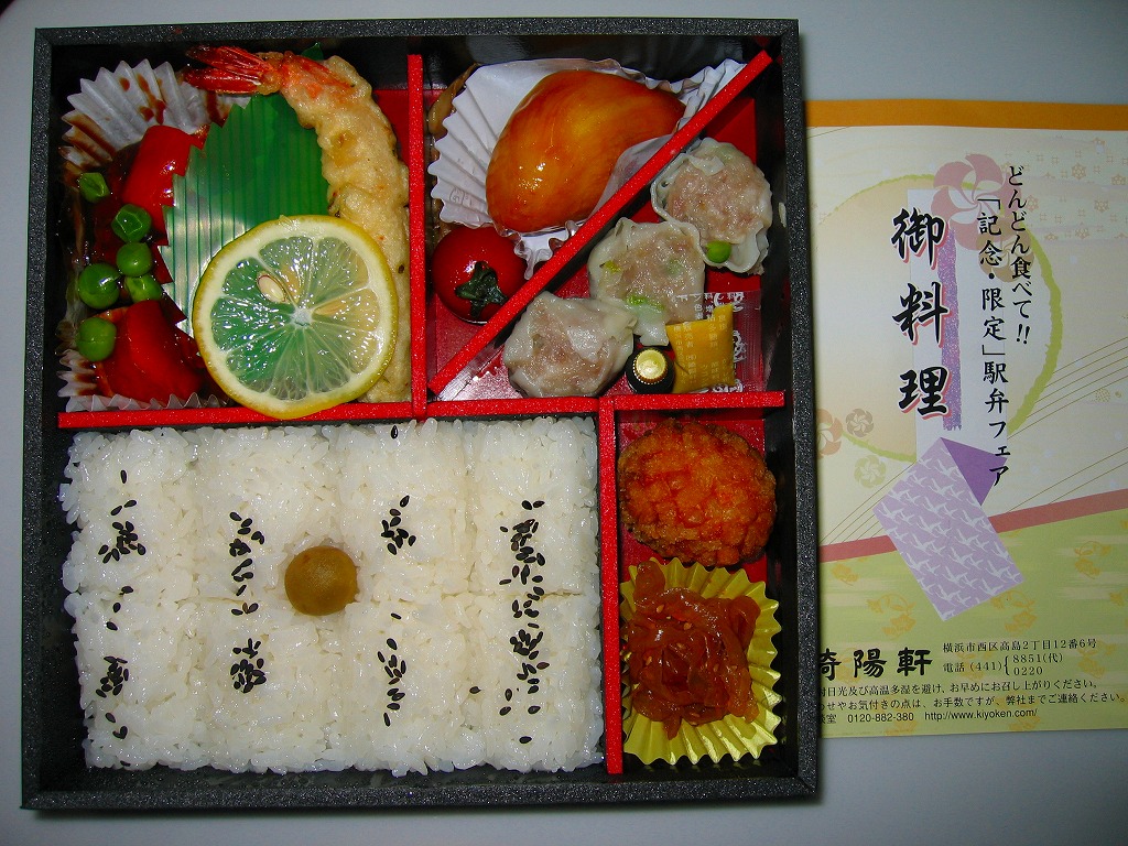 JR横浜支社が管内の駅弁屋4社を集めて2008(平成20)年1月26・27日に横浜駅西口で実施したイベント「どんどん食べて!!記念・限定駅弁フェア」にて販売された記念駅弁。木目調の黒い容器に、イベント名を印字した掛紙を巻いて、ゴムでしばる。中身は日の丸俵飯に酢豚、海老天、大学芋、春巻き、海老団子、中華クラゲなどとシウマイ3個で、毎年4月に東京駅で実施される駅弁の日記念駅弁大会に出品されるものとだいたい同じ。風味もいつもの崎陽軒。記念駅弁の名前にひねりがないのも、いつもの崎陽軒。
