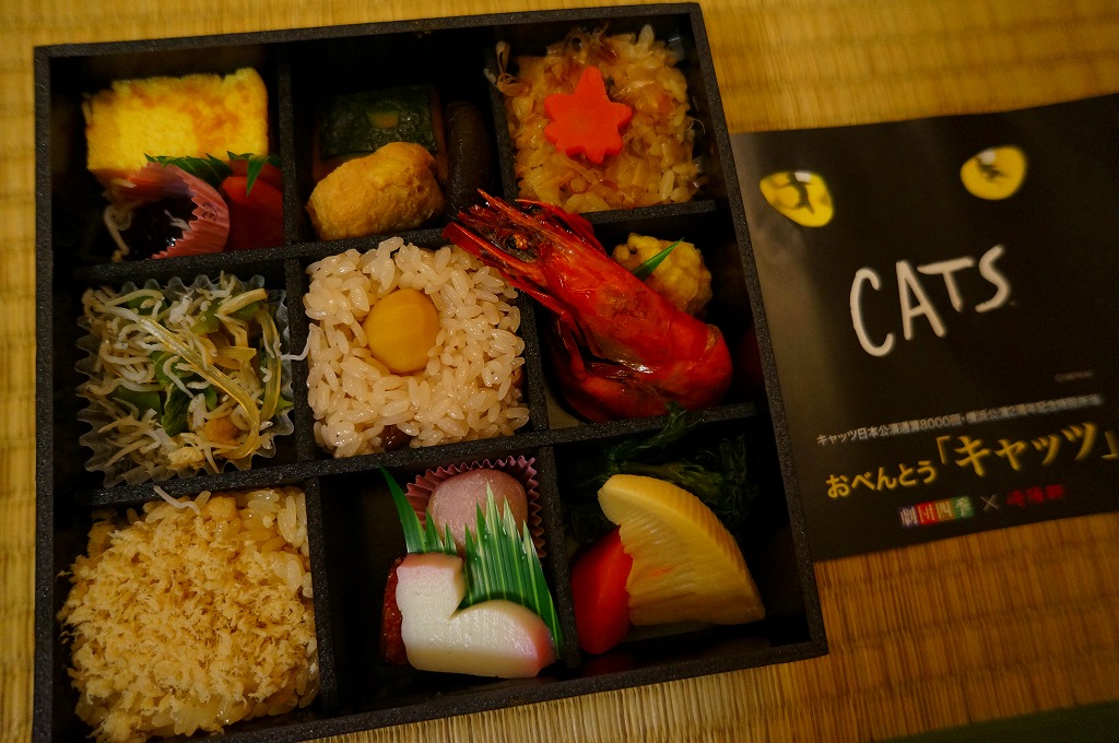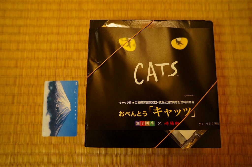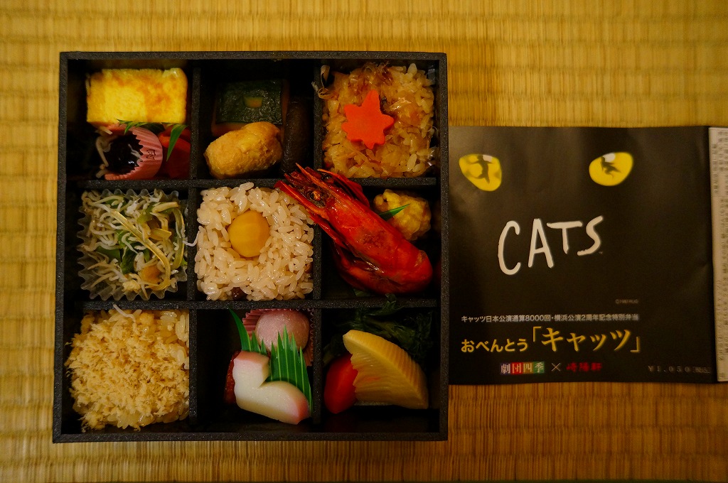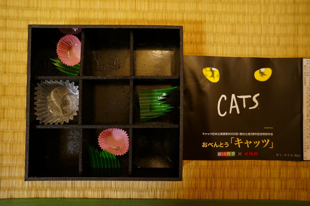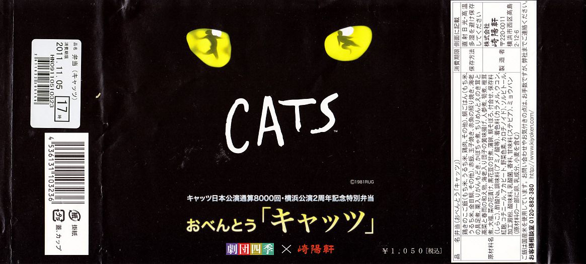 国内では劇団四季が1983(昭和57)年11月から主に仮設劇場をこしらえて公演し続ける驚異のミュージカル「キャッツ」は、2009年11月からは横浜みなとみらい地区の遊休地に仮設劇場を建てて上演されている。2011年10月28日にここで通算8000回公演を達成したことが、この駅弁で記念されている。通常の崎陽軒の弁当と異なり、これは横浜駅周辺の8店舗と「キャノン・キャッツ・シアター」でのみの販売であった。