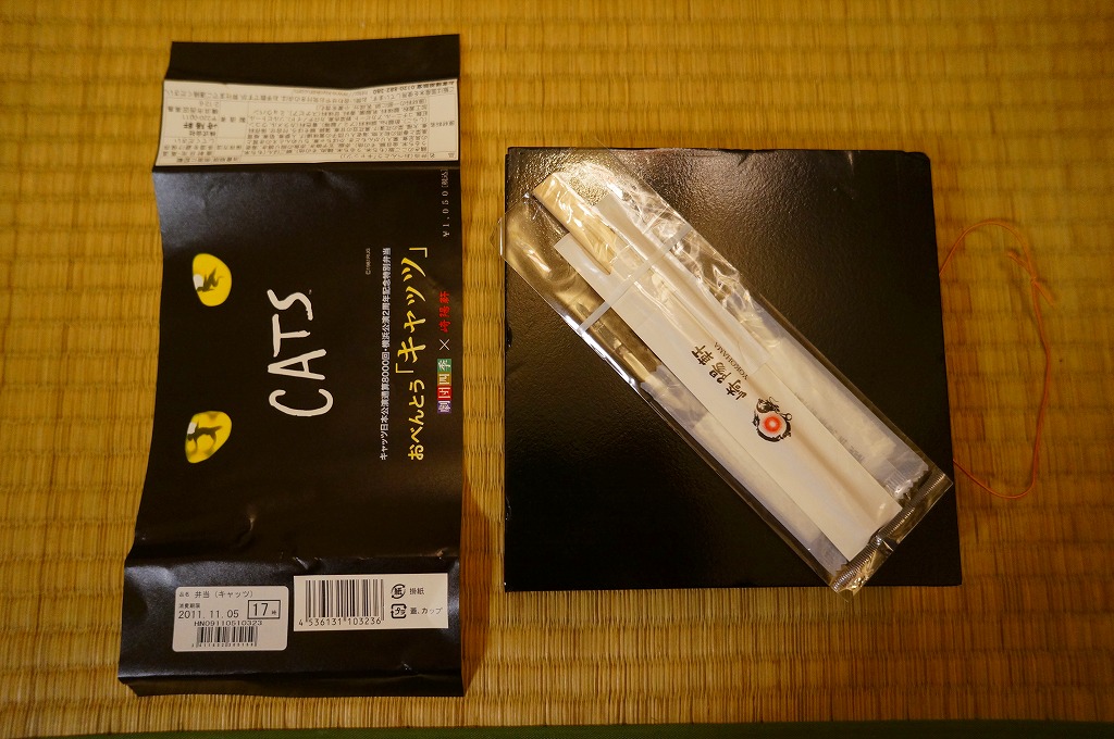 掛紙記載のとおり、キャッツ日本公演通算8000回と横浜公演2周年を記念し、2011(平成23)年10月28日から11月13日まで販売された記念駅弁。そのミュージカルのイメージに合わせて、真っ黒な正方形の容器に、ポスターやチラシと同じ絵柄の黒い掛紙を巻く。