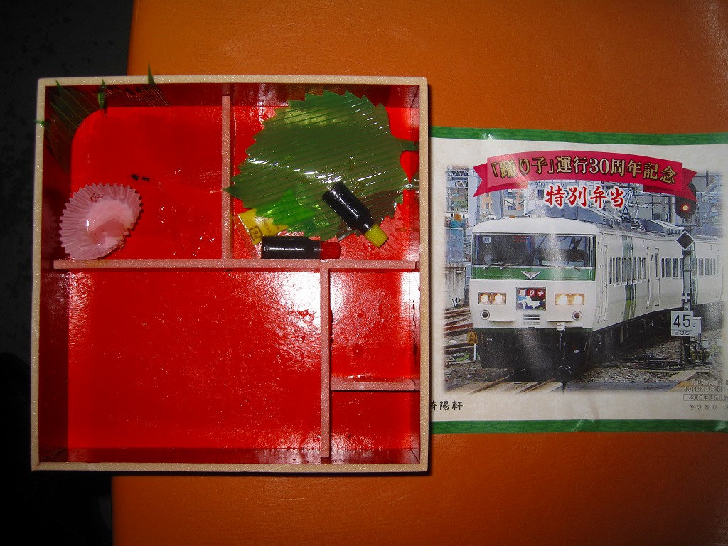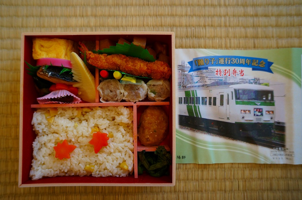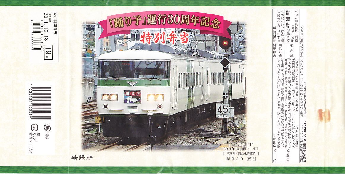 掛紙記載事項のとおり、特急「踊り子」デビュー30周年を記念し、2011(平成23)年10月1日から31日まで販売された記念駅弁。横浜駅弁で「おべんとう秋」などに使う正方形の容器に、踊り子号の写真を掲載した販売期間前半の10月1日から14日までのバージョンである掛紙を巻く。
