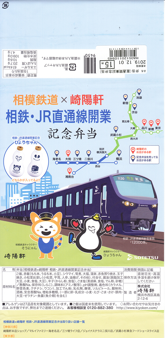相鉄・JR直通線とは、横浜市内で西谷駅と羽沢横浜国大駅をノンストップで結ぶ、約2kmの鉄道新線。ここを経由して、相模鉄道の海老名駅や二俣川駅などと、JR東日本の新宿駅や武蔵小杉駅などとの間で、一日46往復の直通電車が走る。高度経済成長期に沿線人口も輸送量も激増し、バブル崩壊以降にいずれも減少に転じた相模鉄道では、東京都心への直通は沿線価値と知名度と輸送量を確保するための悲願であり、構想の表面化から約15年をかけた大事業であった。この弁当の発売日から、ヨコハマネイビーブルーを名乗る真っ青な電車が、湘南新宿ラインあるいは埼京線や横須賀線の経路を走り始めた。