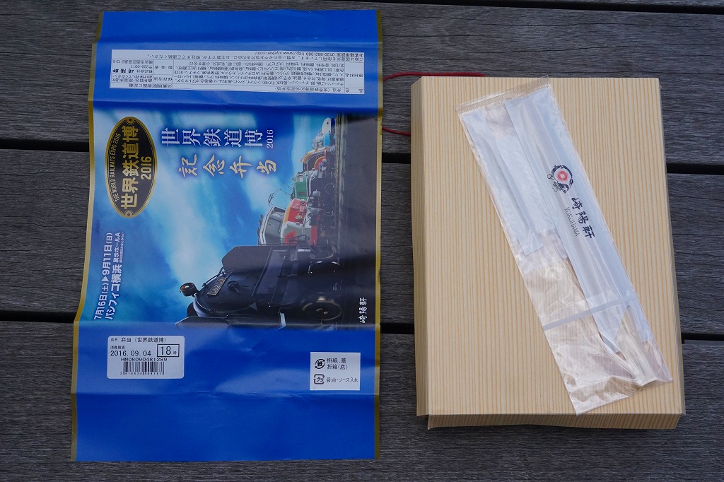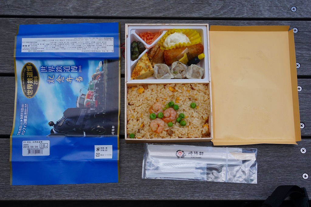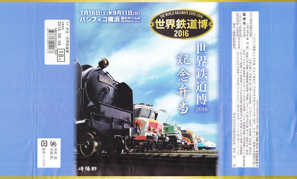 横浜市の展示ホール「パシフィコ横浜」で、2016年7月16日から9月11日まで開催された鉄道模型展示イベント「世界鉄道博2016」の会場で、会場限定のお弁当として横浜駅弁の崎陽軒が販売していたお弁当。横浜駅弁「炒飯弁当」と同じ容器に、イベントのポスターの絵柄を使う掛紙を巻く。