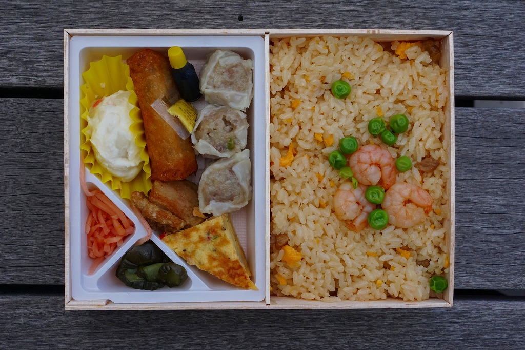 中身も炒飯弁当とほぼ同じで、炒飯にスペイン風オムレツ、春巻き、ポテトサラダ、鶏唐揚、シウマイ3個、漬物、紅生姜。炒飯弁当のおかずのシウマイ3個と鶏唐揚を残し、他をスペイン風オムレツ、春巻き、ポテトサラダにした感じ。