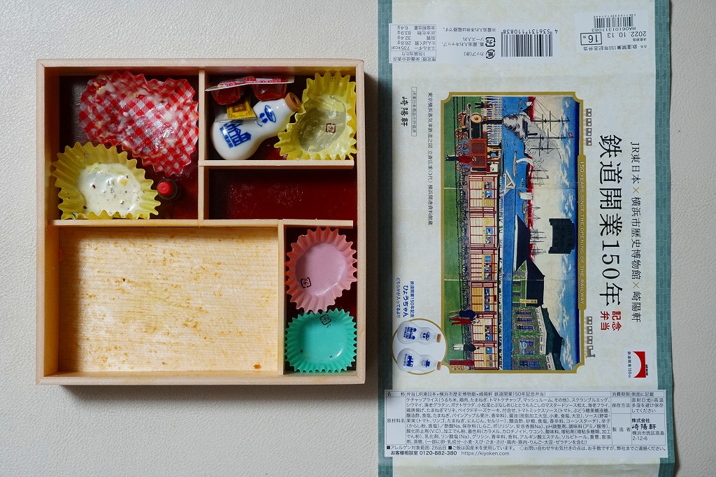 掛紙の表面には鉄道開業当時の錦絵を掲載、裏面には写真付きのおしながきの一部と桜木町駅社員のメッセージを掲載。中身はオムライス、海老グラタン、小松菜とぶなしめじととうもろこしのマスタードソース和え、海老フライ、鶏唐揚、ポテトサラダ、玉ねぎのマリネ、ミニベイクドチーズケーキ、昔ながらのシウマイ3個、特製の磁器の醤油入れ。鉄道開業の地である横浜らしさを洋風のおかずで表現したという。
