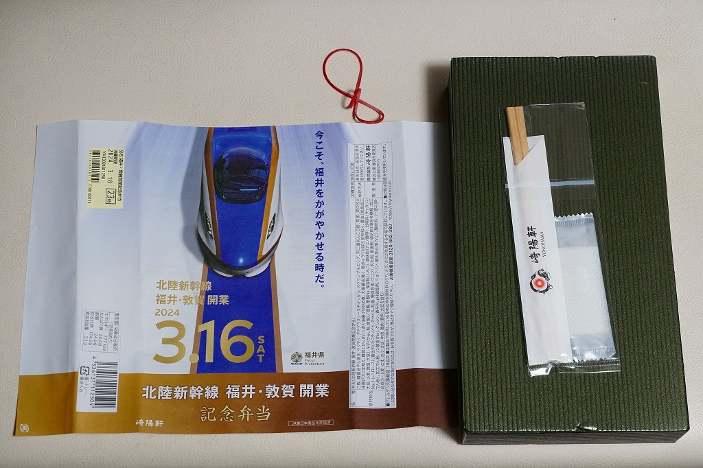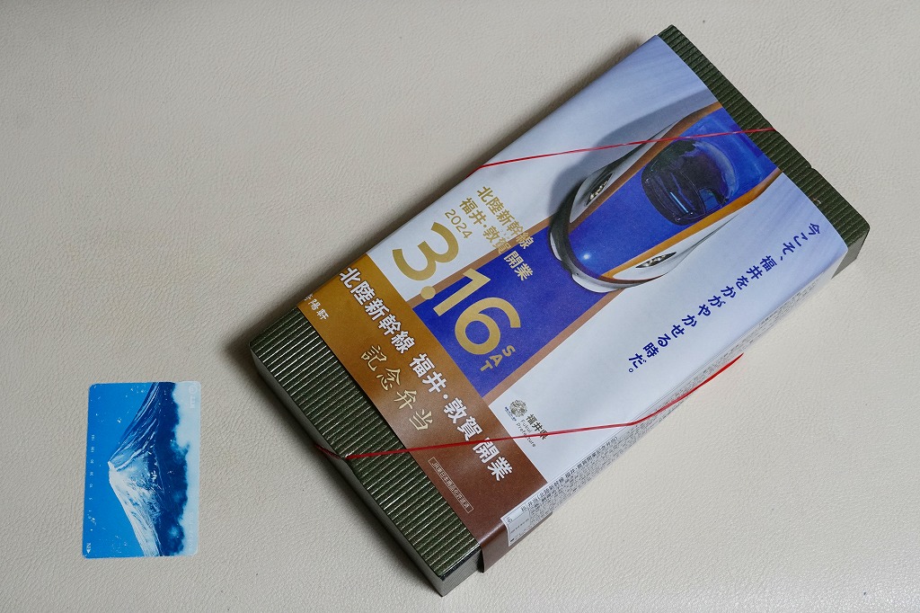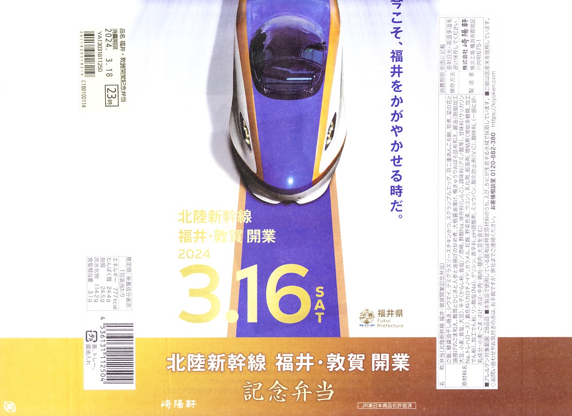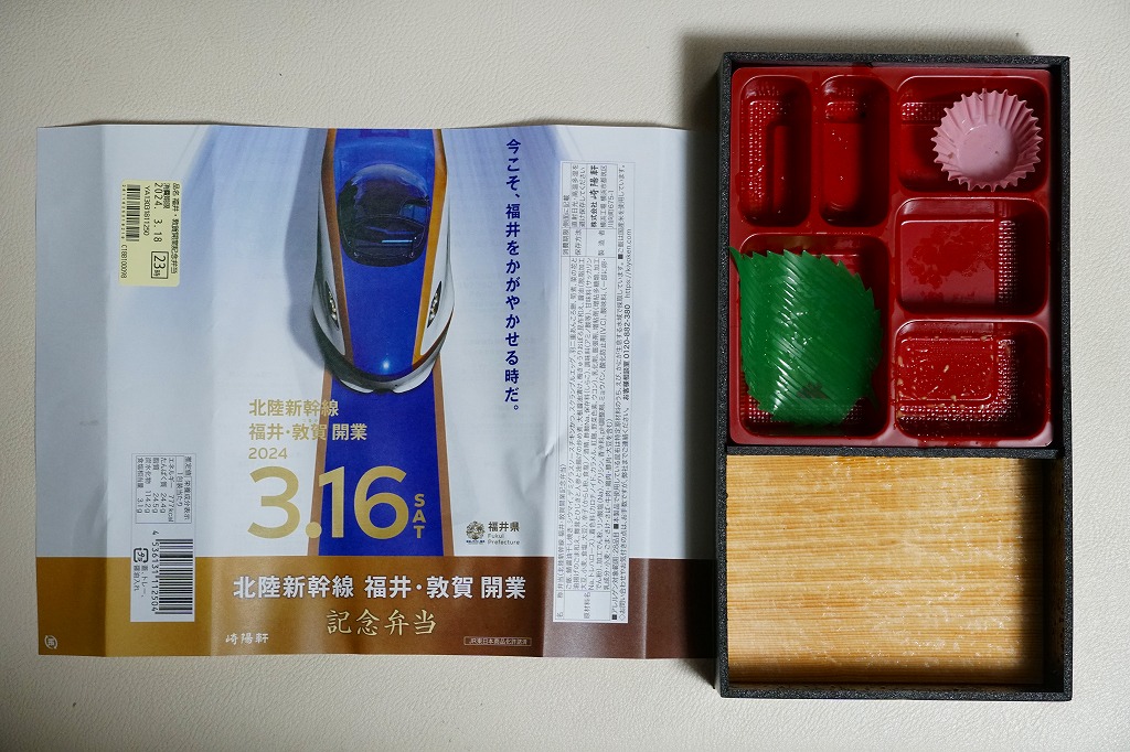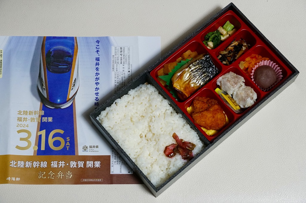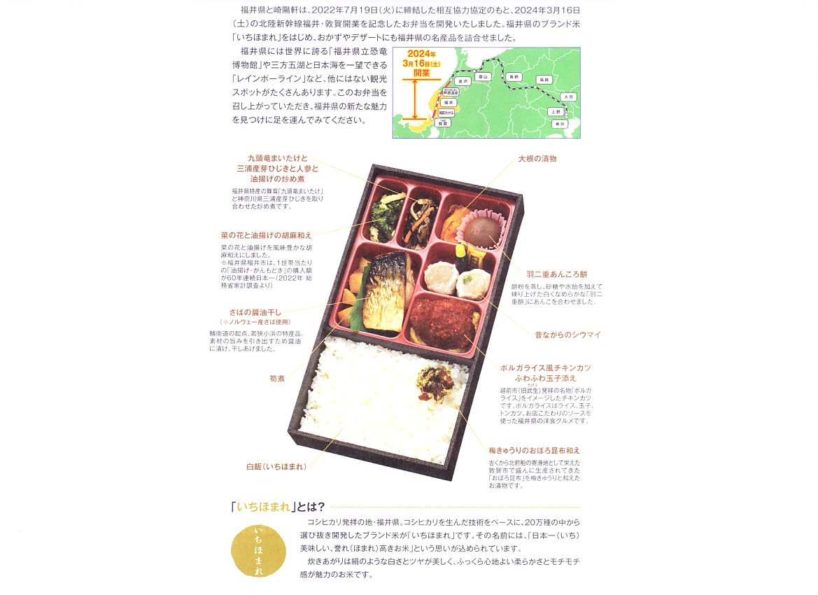 掛紙には北陸新幹線の電車と延伸開業日などが記される。掛紙の裏面でカラー写真を使い紹介する中身は、福井米いちほまれの白飯、さばの醤油干し、菜の花と油揚げの胡麻和え、九頭竜まいたけと三浦産芽ひじきと人参と油揚げの炒め煮、ボルガライス風チキンカツ、大根の漬物、羽二重あんころ餅など。あまり知らない福井県も取り入れた、大きめなお弁当。