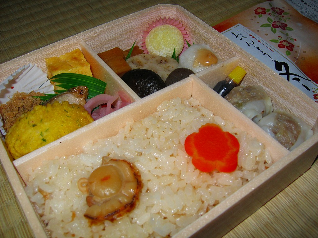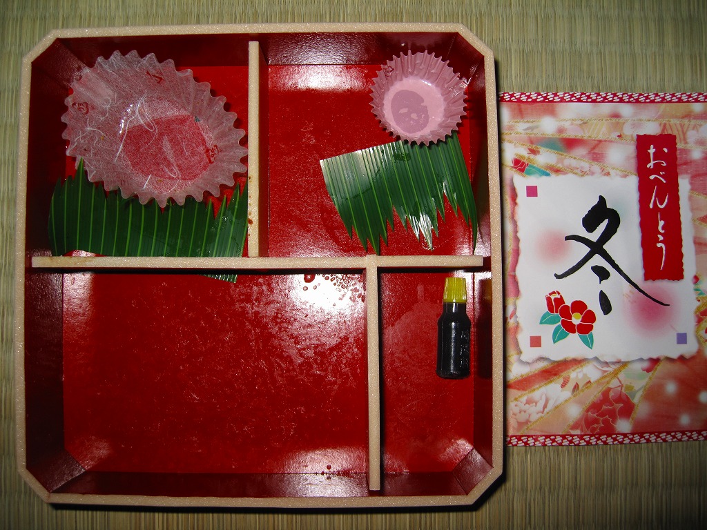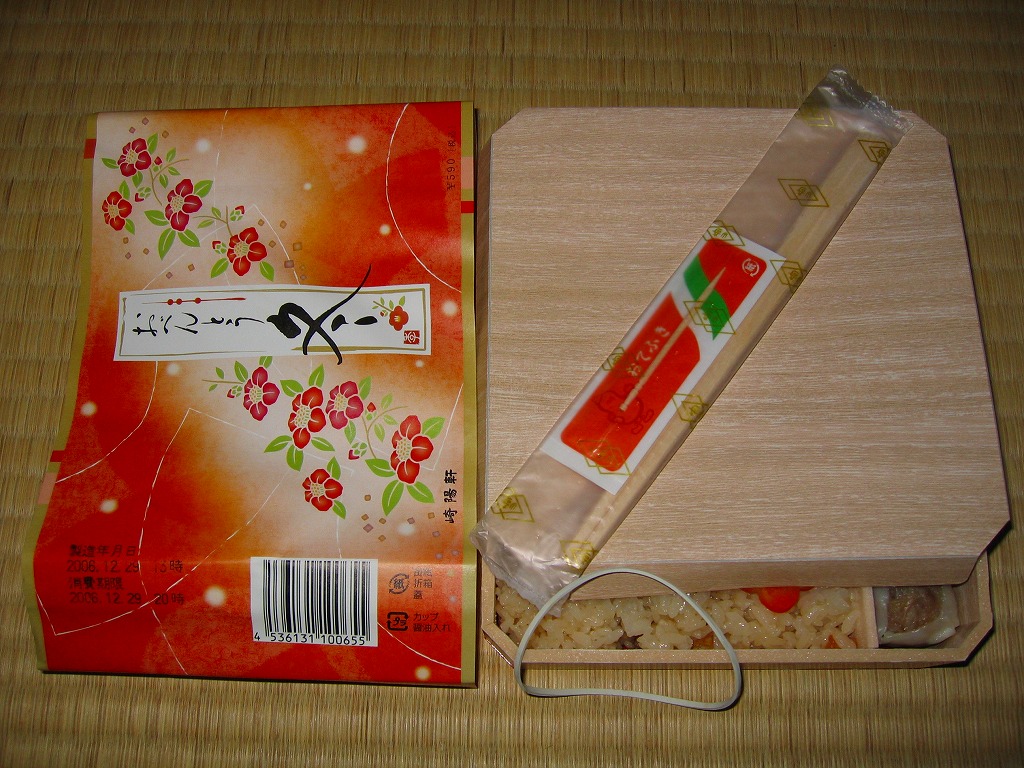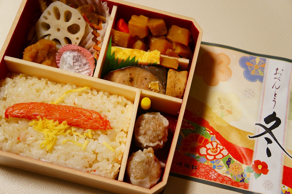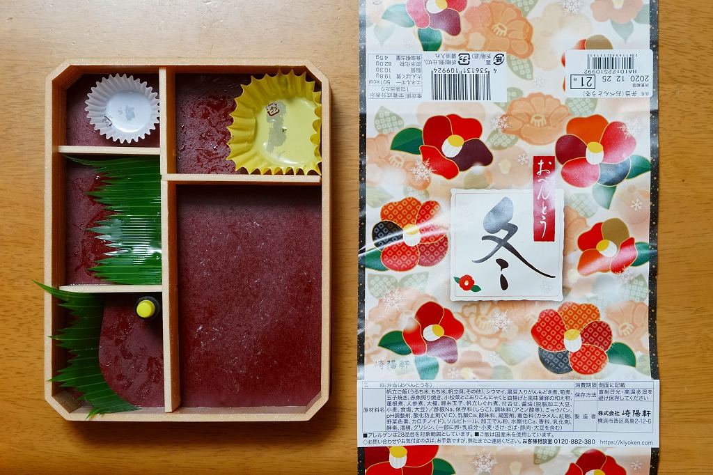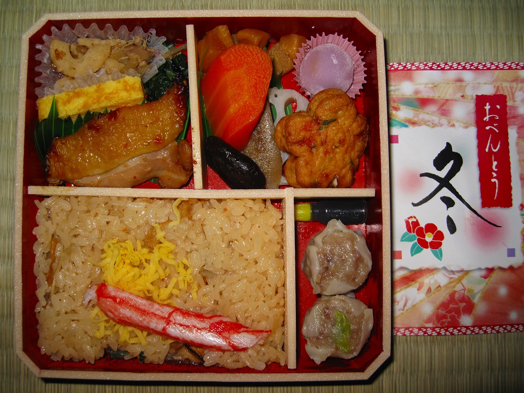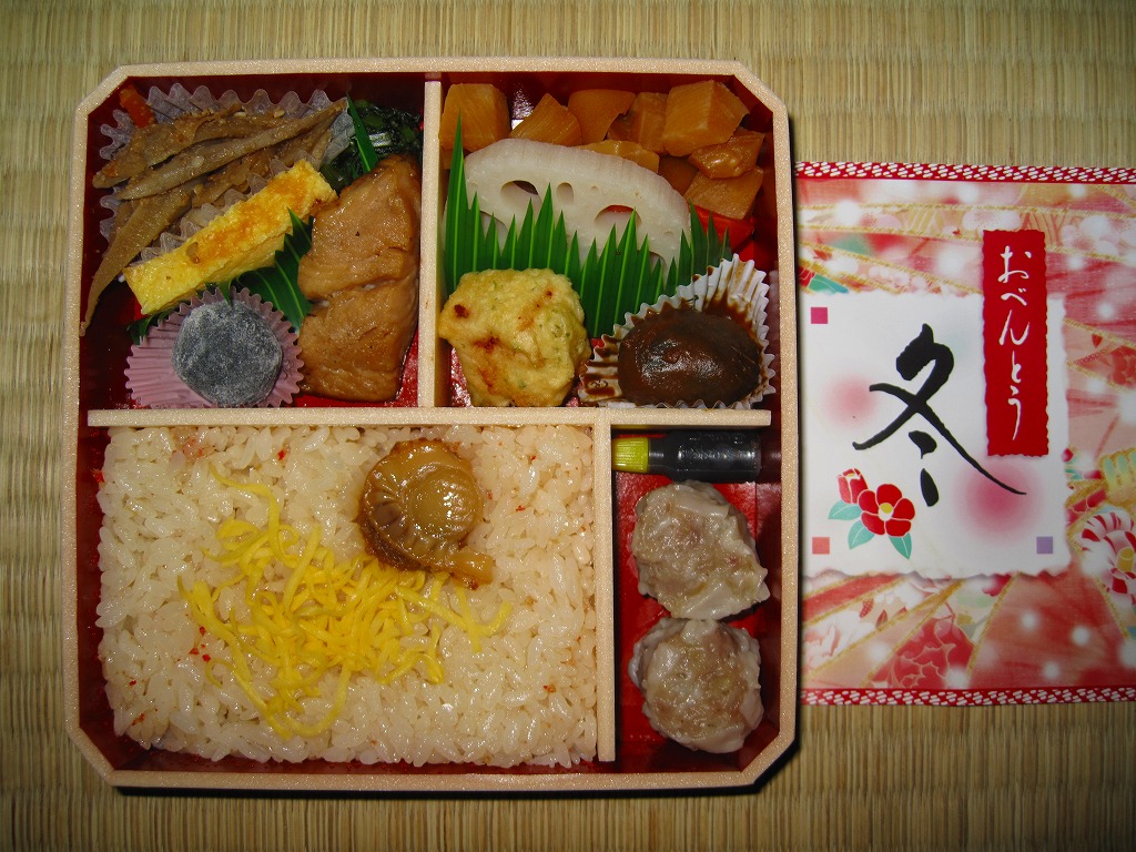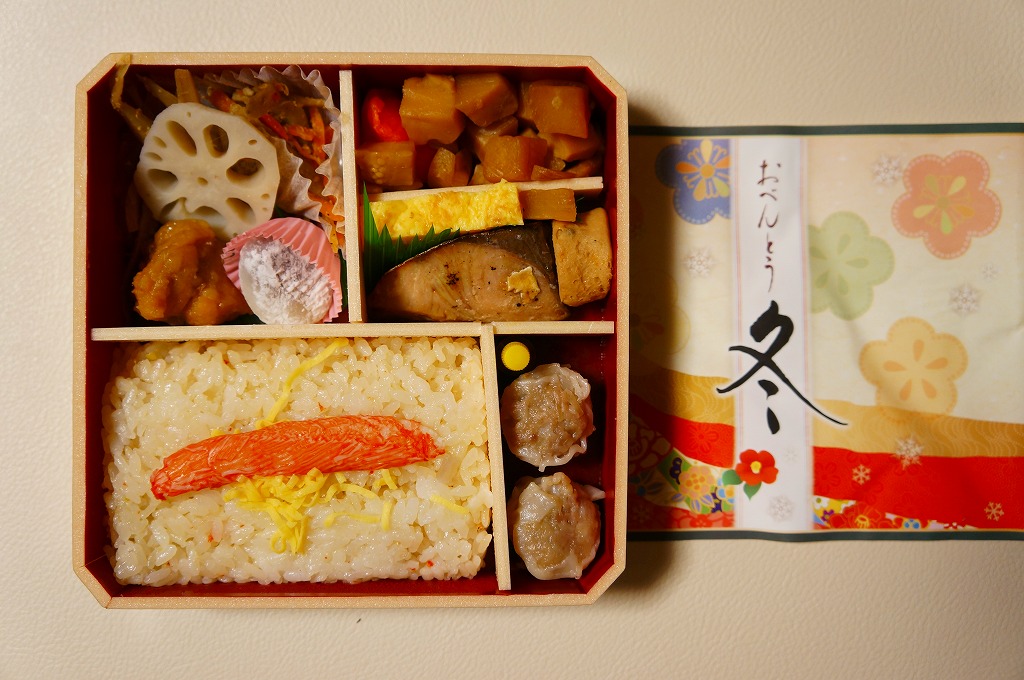 2003(平成15)年12月1日に初めて発売した、横浜駅の冬季限定の駅弁。他の季節と同じ小ぶりな正方形の容器を使用、中身は2003年版で、白胡麻をかけた白御飯に、正月のおせち料理をイメージしたという蒲鉾や黒豆や伊達巻に昆布天、他にはマグロやブリなどに、横浜らしくシウマイ2個と、デザートには雪見餅。これらの季節駅弁はシウマイ御弁當と同様、駅弁としてだけでなく街弁やデパ弁としても親しまれている。