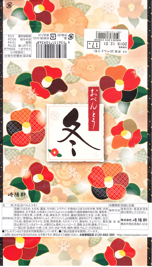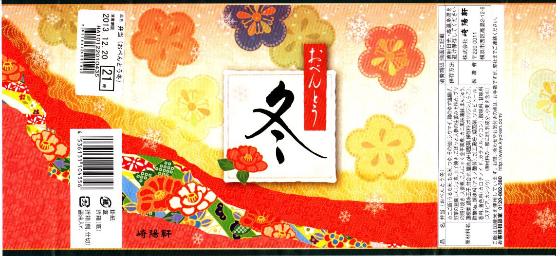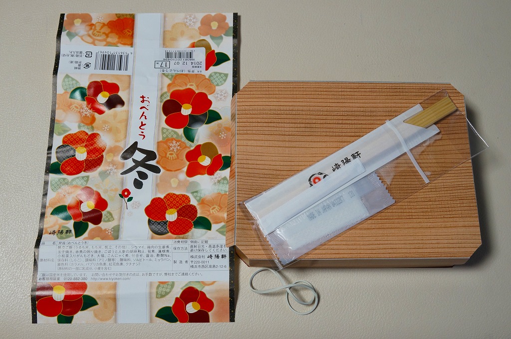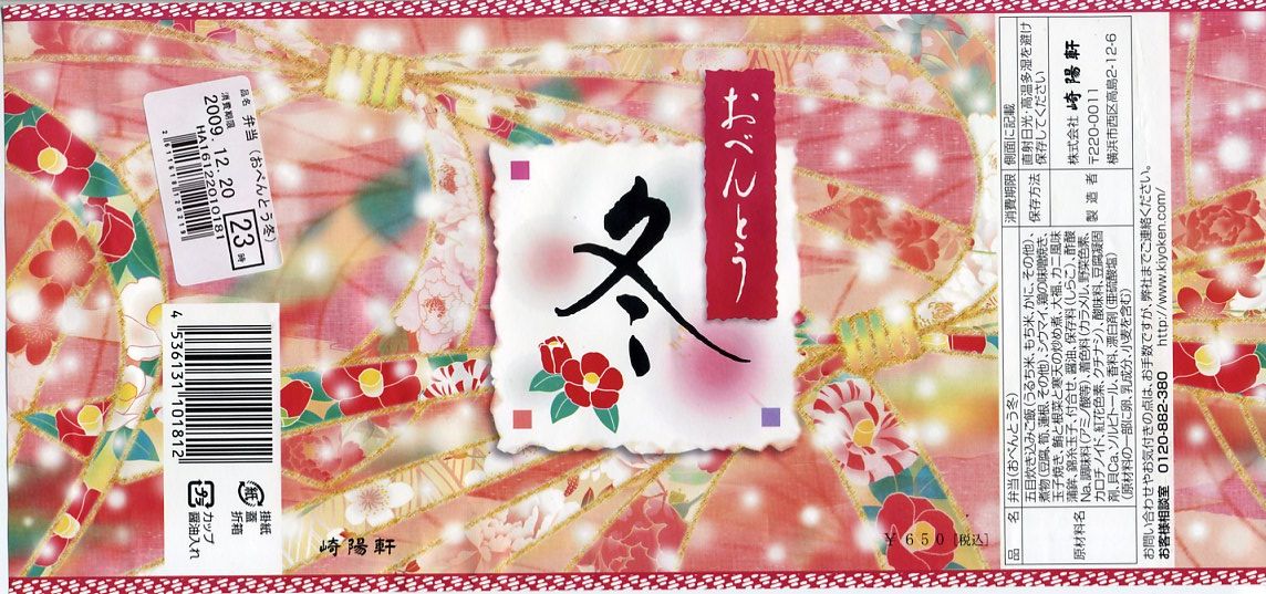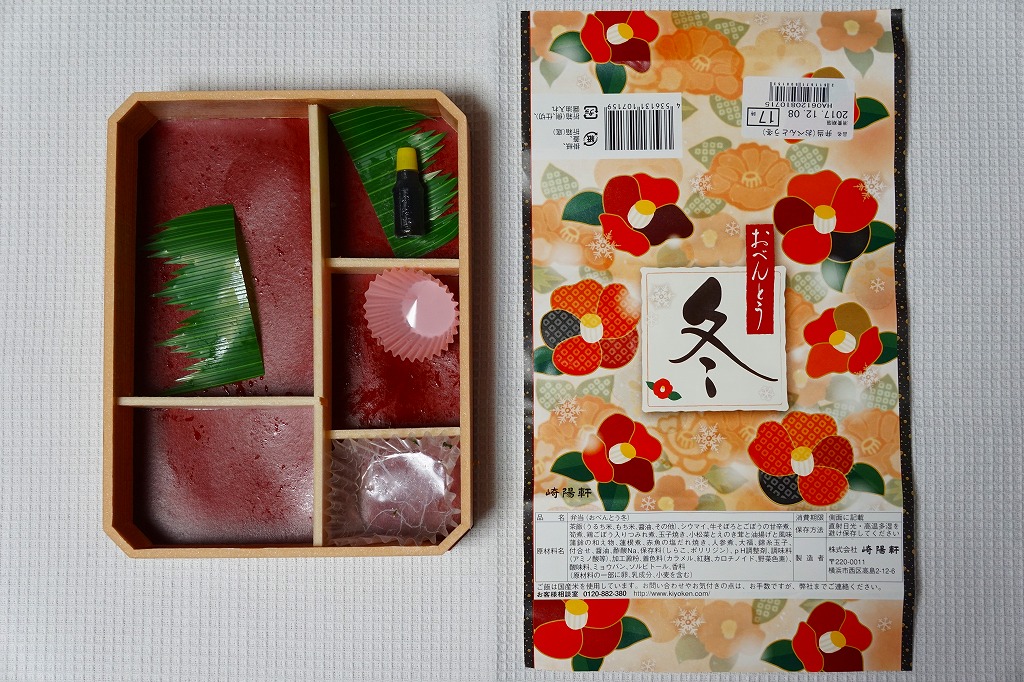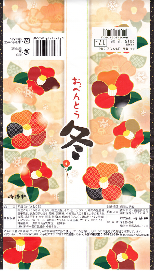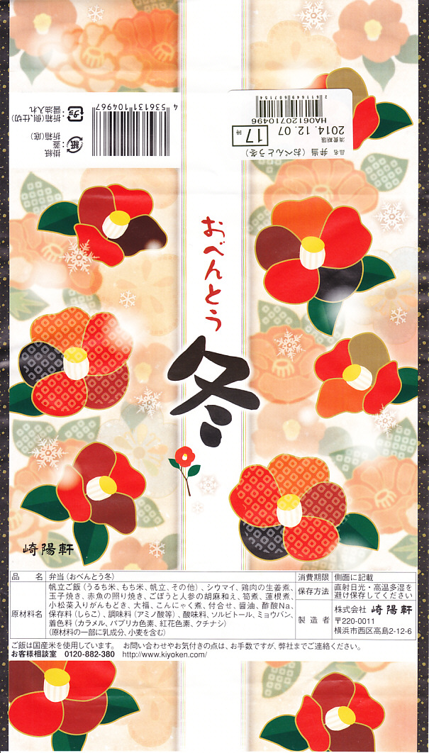 2003(平成15)年12月に初めて販売した、横浜駅の冬駅弁「おべんとう冬」の2014(平成26)年版で、12月1日から1月31日までの販売。この年の「秋」からのリニューアルに従い、容器が少し細長くなり、掛紙で引き続きツバキを描きながら横長から縦長に変わり、価格は30円のアップ。