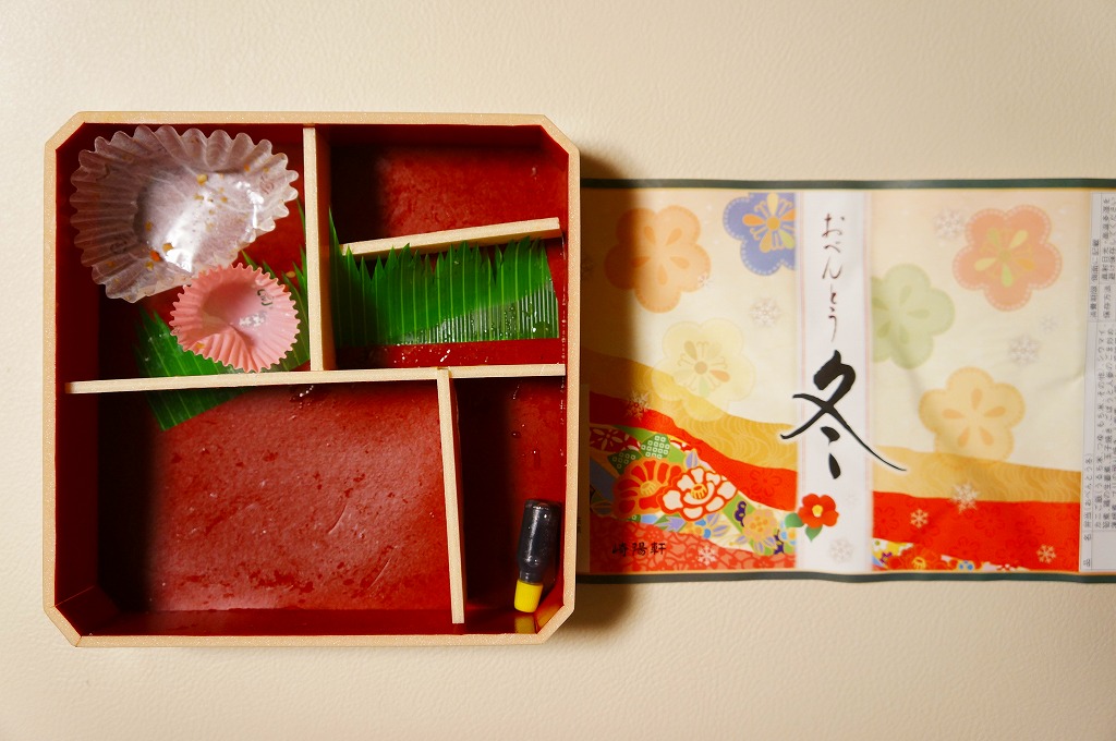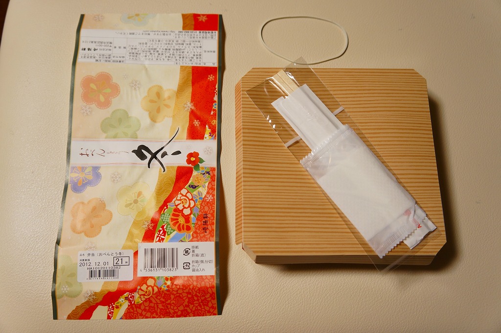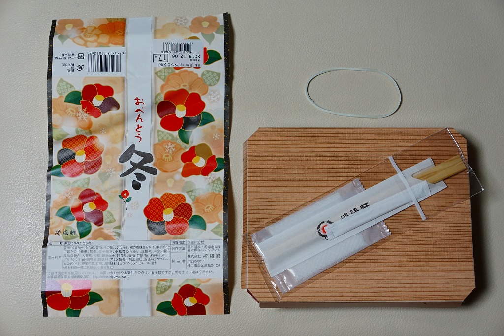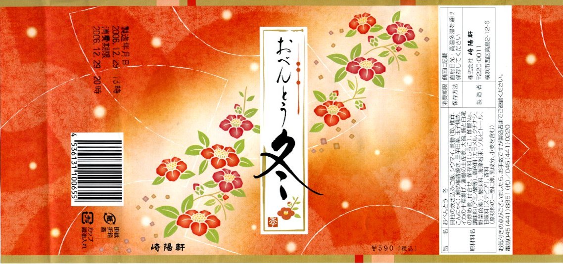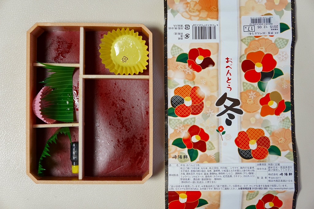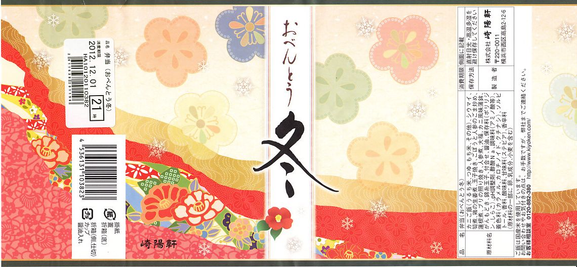 2003(平成15)年12月に初めて販売した、横浜駅の冬駅弁「おべんとう冬」の2014(平成26)年版で、12月1日から1月31日までの販売。この年の「秋」からのリニューアルに従い、容器が少し細長くなり、掛紙で引き続きツバキを描きながら横長から縦長に変わり、価格は30円のアップ。
