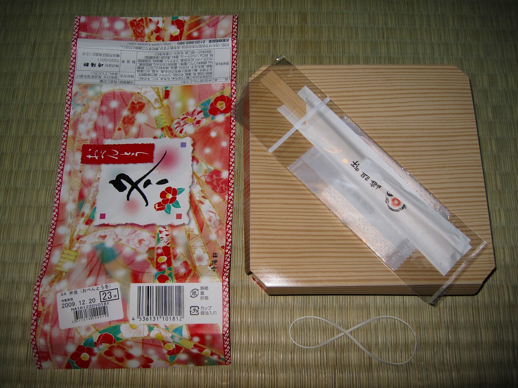 2003(平成15)年12月に初めて販売した、横浜駅の冬駅弁「おべんとう冬」の2009(平成21)年版で、12月1日から1月31日までの販売。今回の中身はベニズワイガニの五目飯に鶏味噌焼、花形豆腐なる薩摩揚などの煮物、マグロと根菜の炒め煮、タケノコ煮、玉子焼、野沢菜漬、シウマイ2個、小粒大福など。冬なのに、でも冬だからか、掛紙も中身の彩りも温かい感じのお弁当。もちろん、実物は常温でそこそこ冷えている。