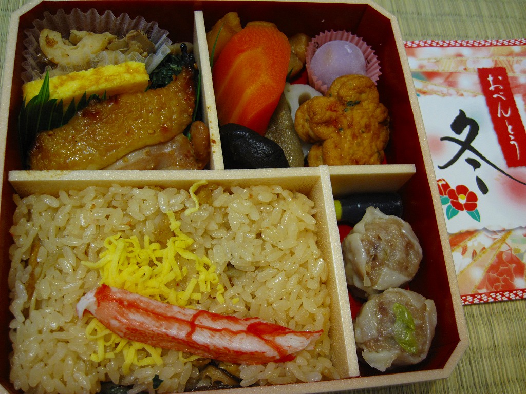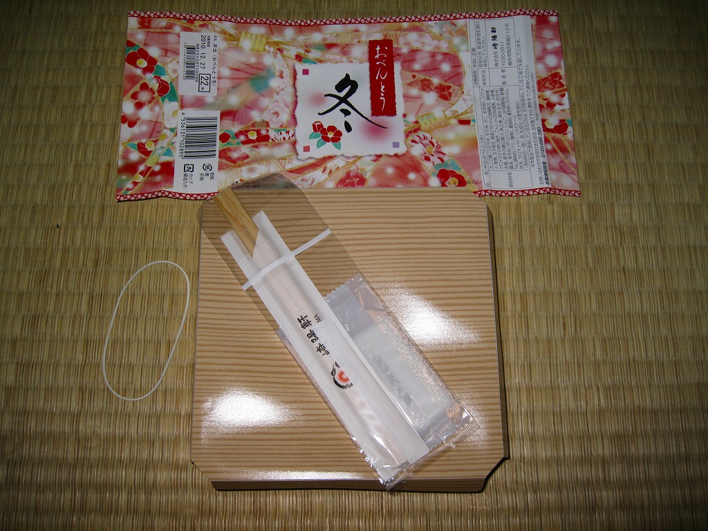 2003(平成15)年12月に初めて販売した、横浜駅の冬駅弁「おべんとう冬」の2010(平成22)年版で、12月1日から1月31日までの販売。今回の中身はカニ御飯にクロメヌケ照焼、ナガイモ磯辺揚、コンニャクの赤味噌煮、レンコンやニンジンなどの煮物、根菜とちくわの胡麻和え、玉子焼、野沢菜漬、シウマイ2個、黒ごま団子。カニの風味を探せなかった以外は、見たとおり内容通りの味。価格は2010年9月の全商品値下げを反映してか、前年より10円下がった。