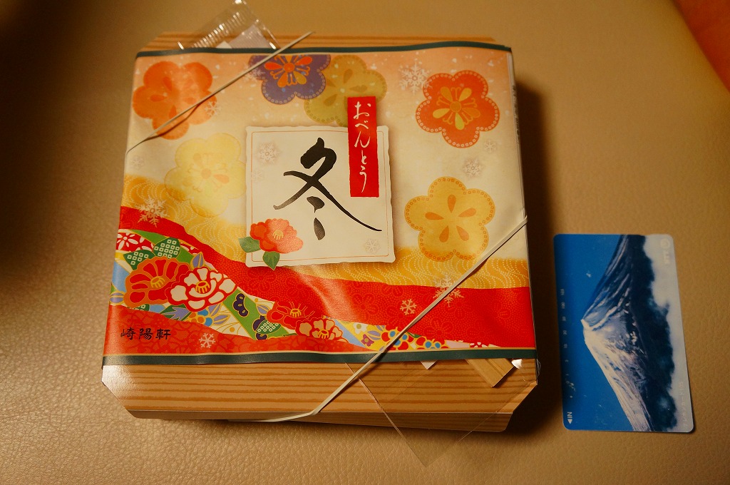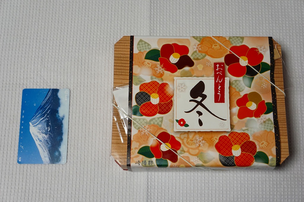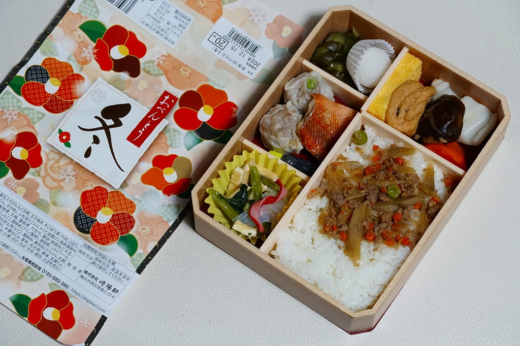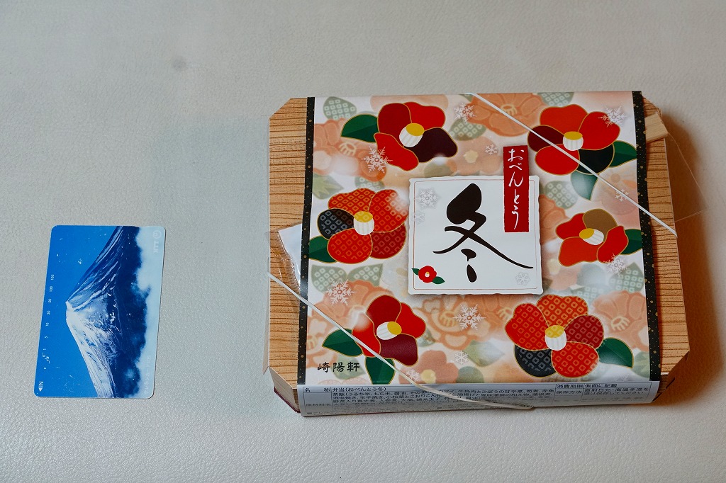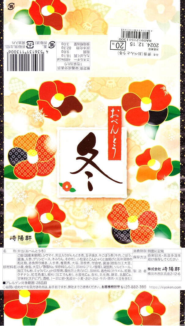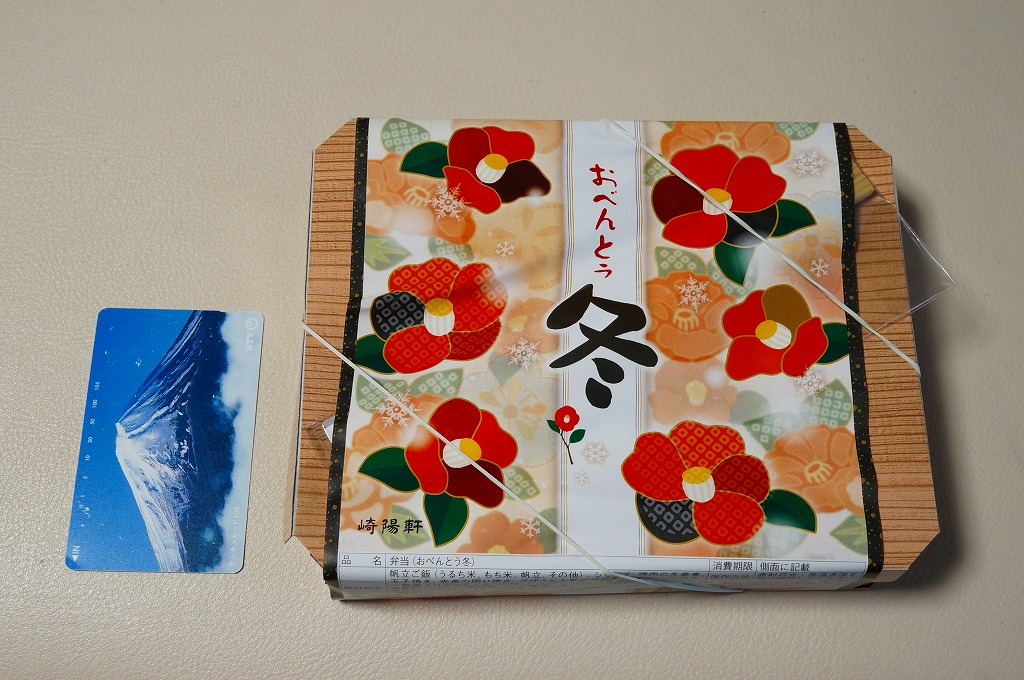 2003(平成15)年12月に初めて販売した、横浜駅の冬駅弁「おべんとう冬」の2024(令和6)年度版で、12月1日から1月31日までの販売。掛紙のツバキの絵柄は2017年から変わらない。中身は白飯に牛ごぼう煮とグリーンピースを載せ、赤魚の照焼、がんもどき煮、小松菜とこんにゃくと油揚げと風味蒲鉾の和え物、レンコンとニンジンとシイタケの煮物、玉子焼、きゅうり漬け、小粒大福、シウマイ2個を添えるものに変化。内容が少し簡素化された一方で、価格はまた50円上がった。