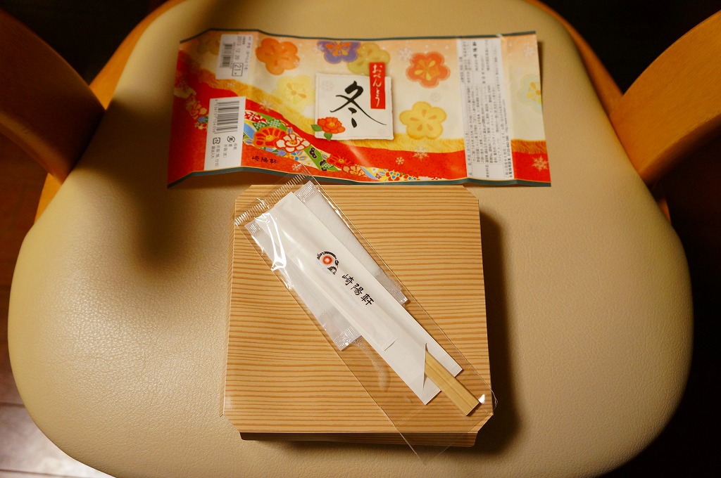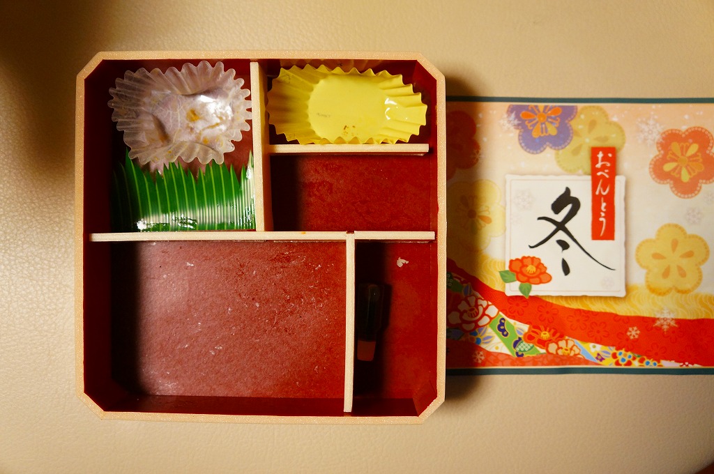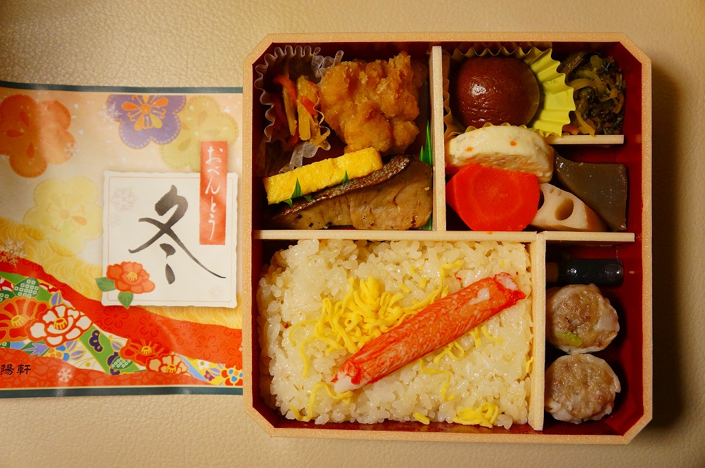 2003(平成15)年12月に初めて販売した、横浜駅の冬駅弁「おべんとう冬」の2012(平成24)年版で、12月1日から1月31日までの販売。掛紙の絵柄はおとなしくなり、今回の中身はカニ御飯、ブリ照焼、鶏肉の生姜煮、ニンジンとレンコンの煮物、タケノコ煮、根菜のごま炒め、味噌ダイコン、シウマイ2個、玉子焼き、小粒大福。2009年版と似ている気がした。